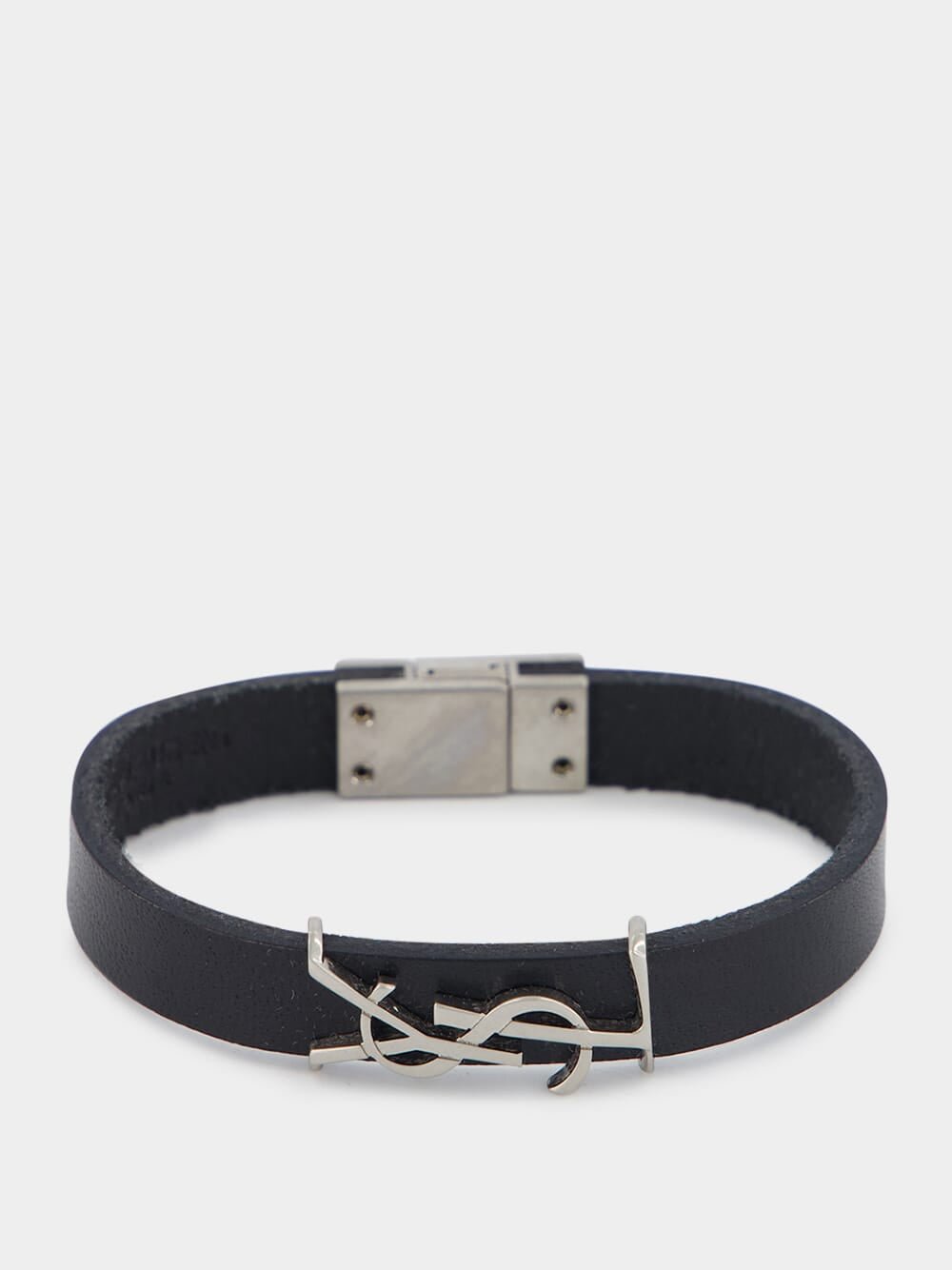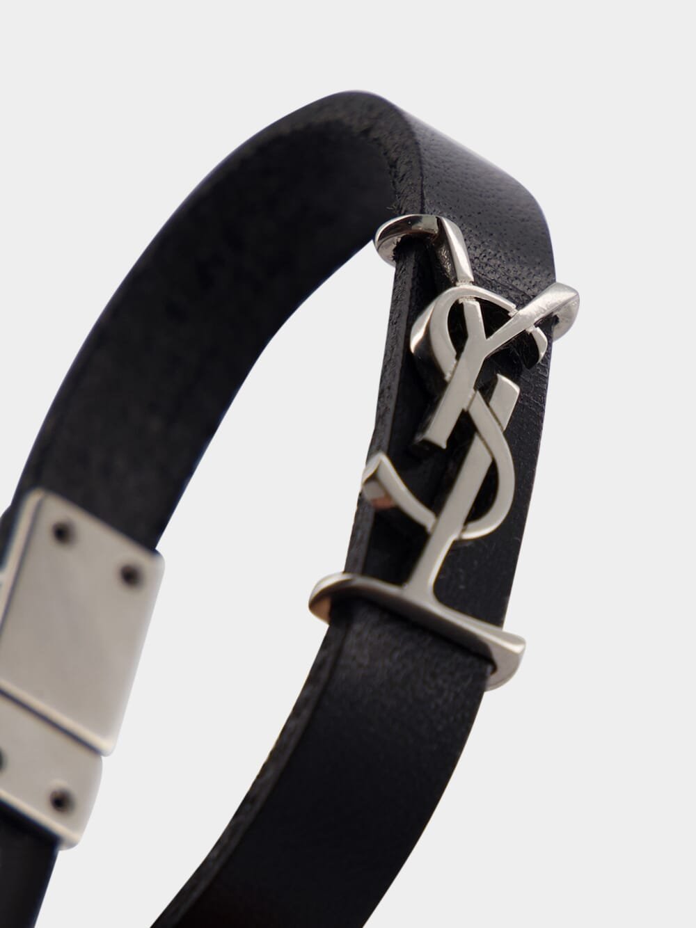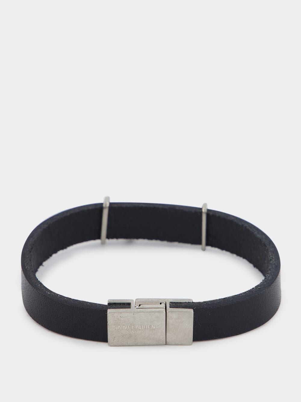 Leather Logo Bracelet, crafted with premium leather and adorned with sleek logo lettering. The brass and silver-tone hardware elegantly complement the rich black leather, while the secure clasp fastening ensures both comfort and security.