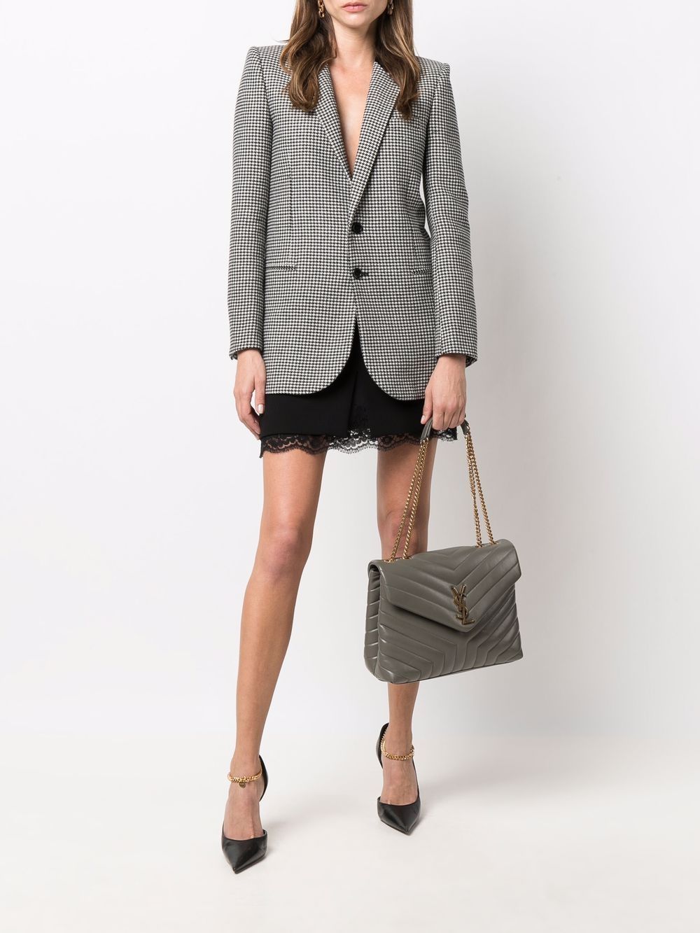 Saint Laurent Loulou grey quilted matelassé leather bag with golden metal YSL initials, a leather and chain sliding strap and magnetic snap closure.