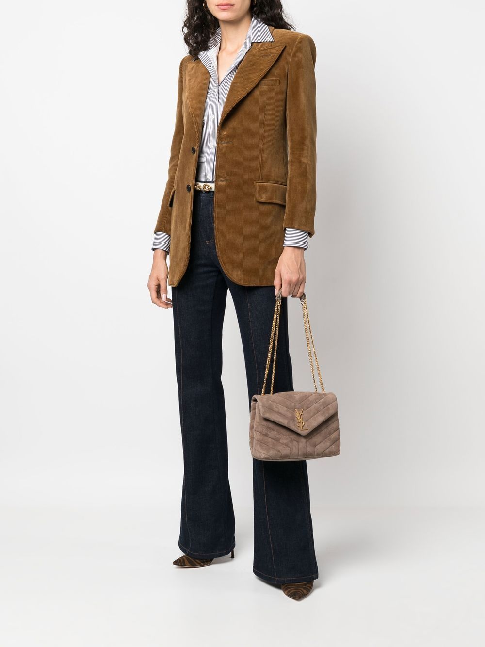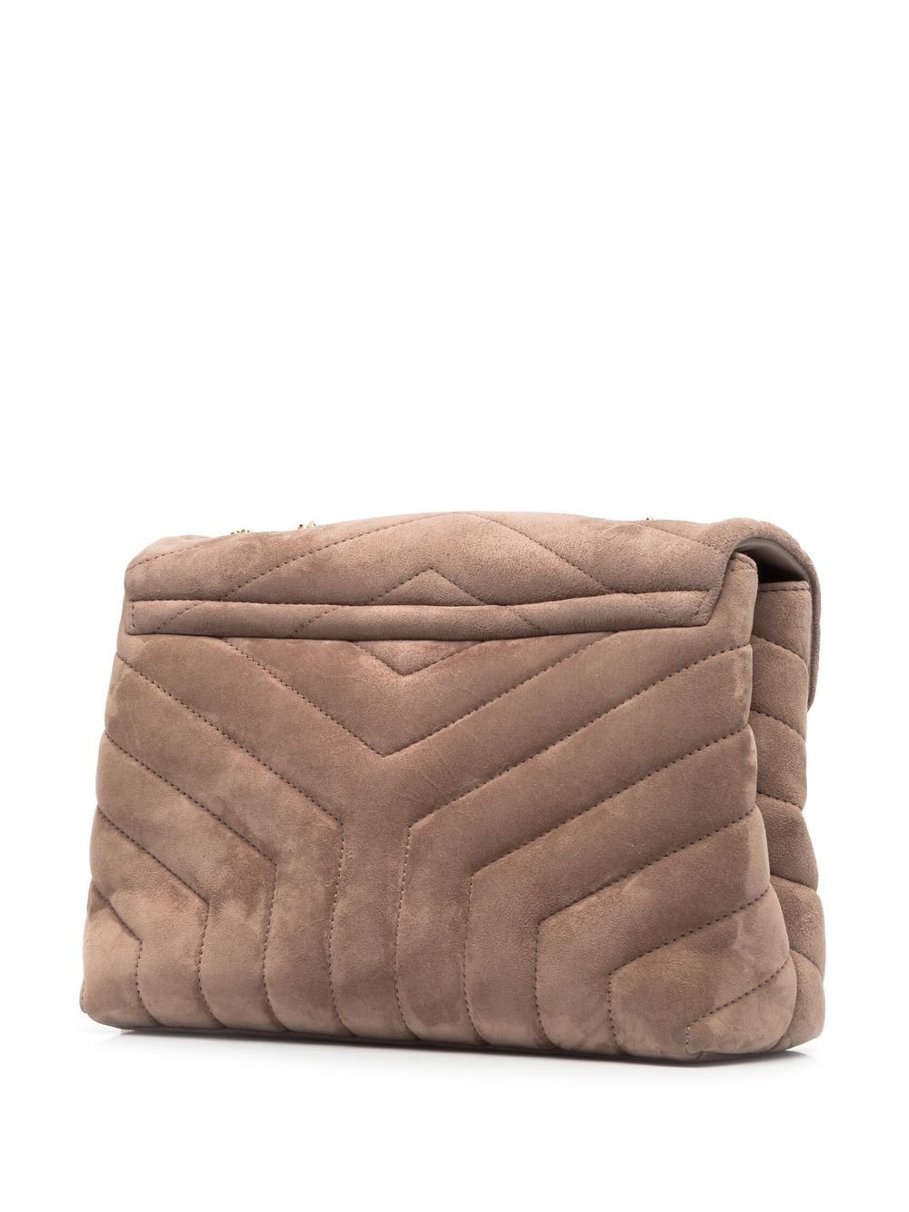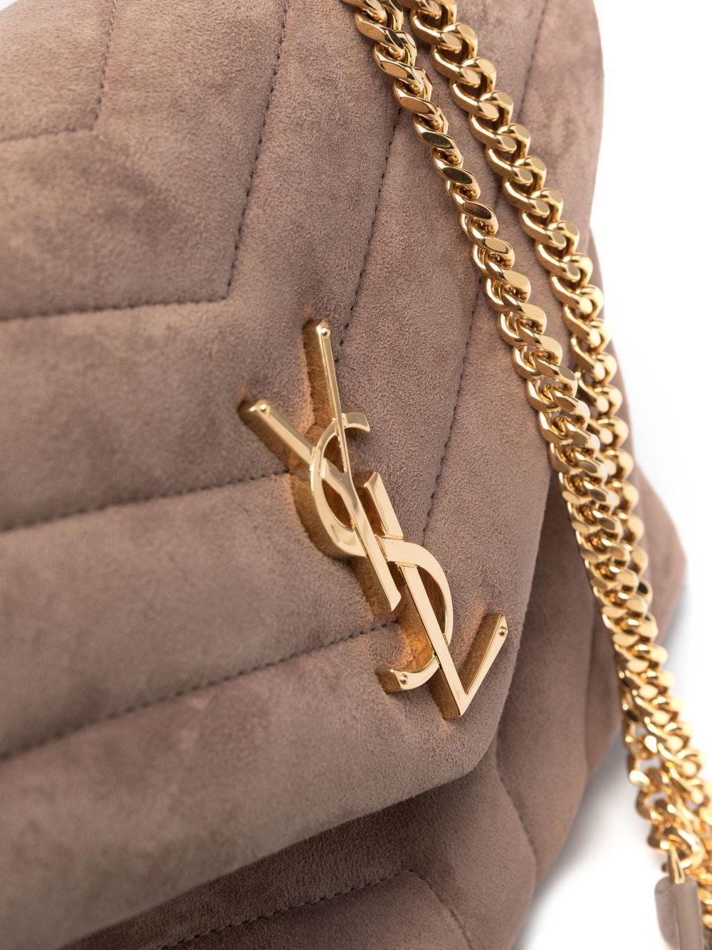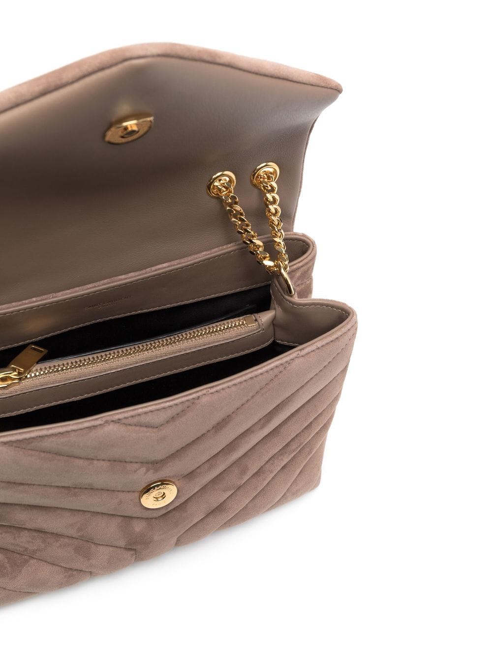 Saint Laurent Loulou small quilted suede shoulder bag in taupe. This iconic bag features golden metal YSL initials, a leather and chain sliding strap that can be worn doubled on the shoulder and magnetic snap closure.