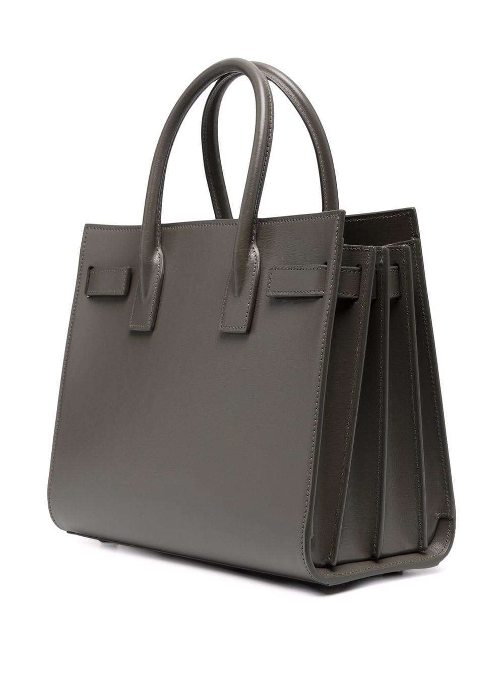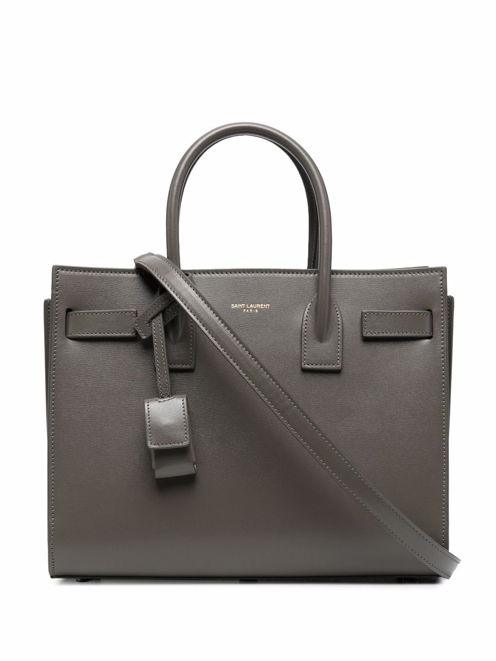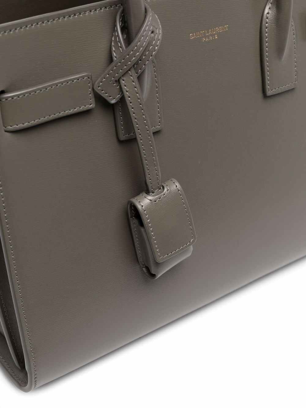 Saint Laurent Sac De Jour dark grey leather small handbag with tubular handles, accordion sides and snap closure.