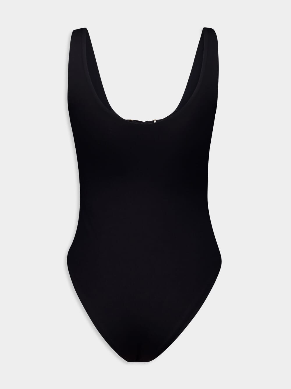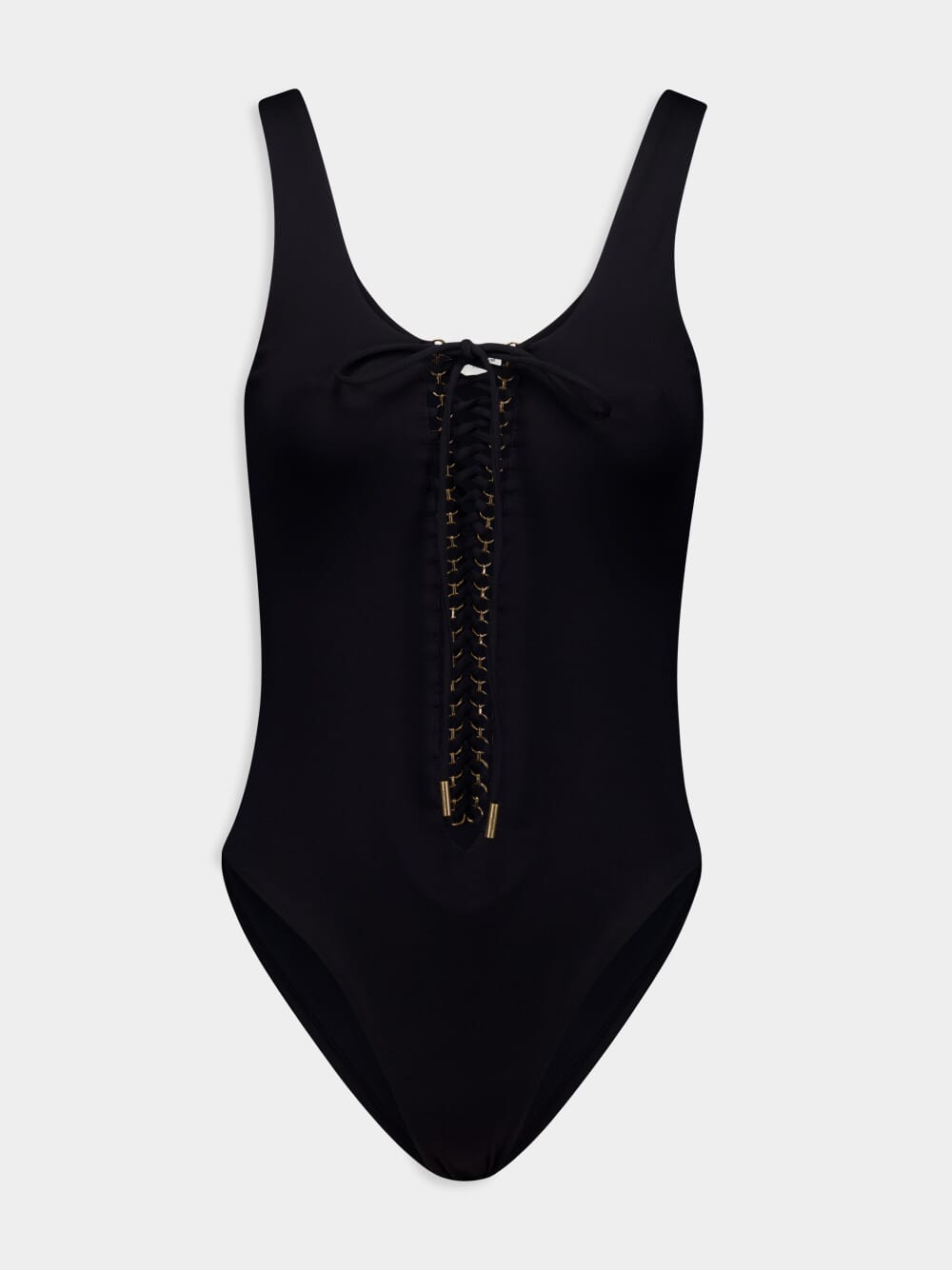 The Saharienne swimsuit offers a striking design with intricate braid detailing at the front. This sophisticated one-piece is perfect for elevating your beachwear collection with its elegant and timeless style.
