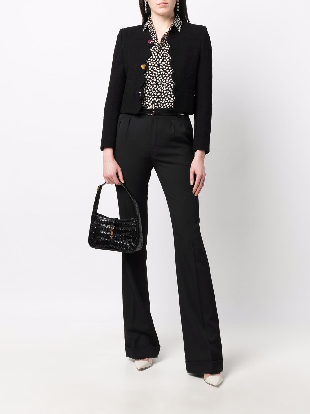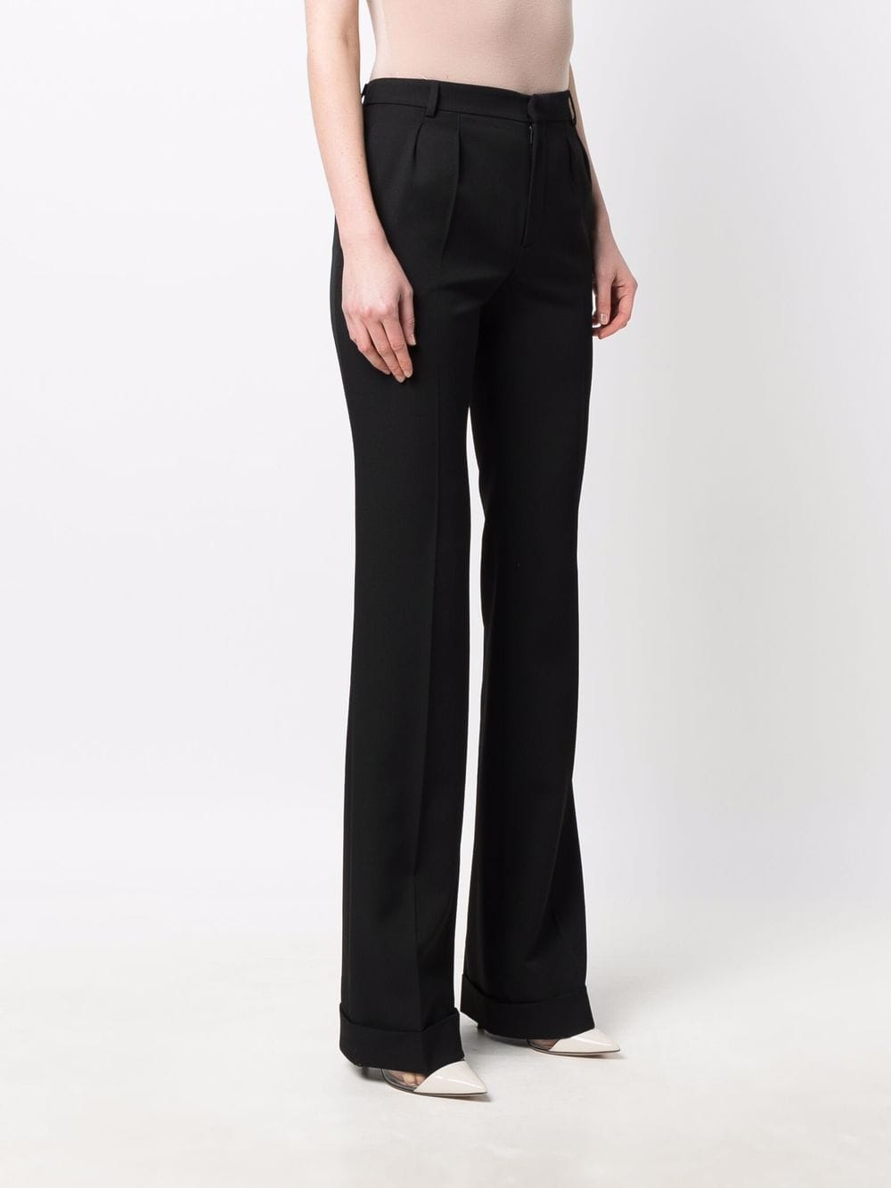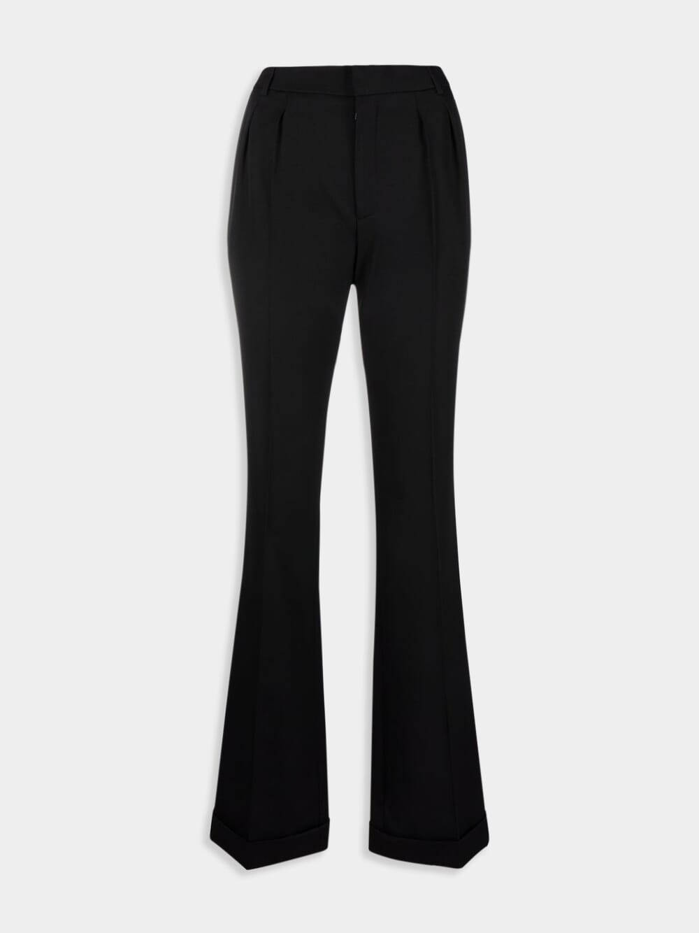 Saint Laurent black wool straight trousers with concealed side slash pockets and pleates.