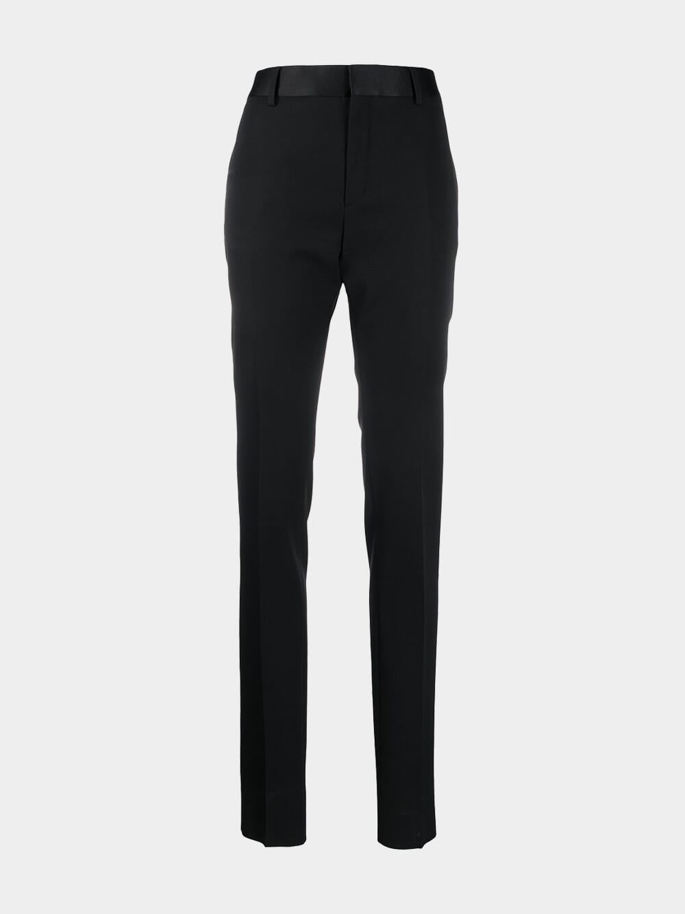 Saint Laurent Straight-leg tuxedo pants in Grain Poudre in black with satin waistband and belt loops, made with responsible wool from certified and sustainable managed farms, featuring darts at the front, piped pockets on the front and on the back with buttons.