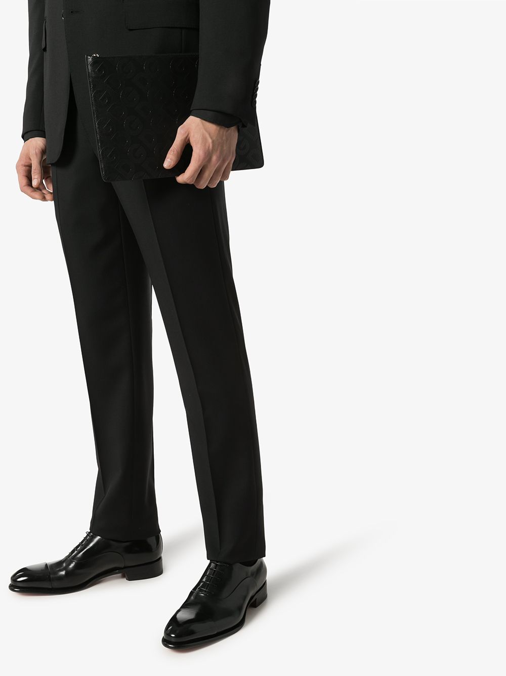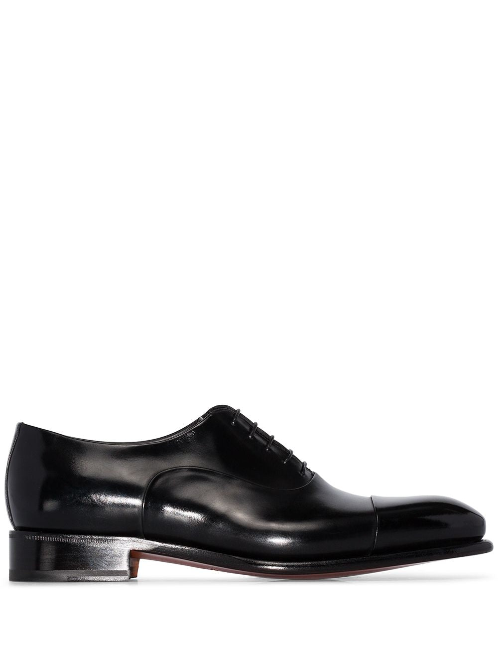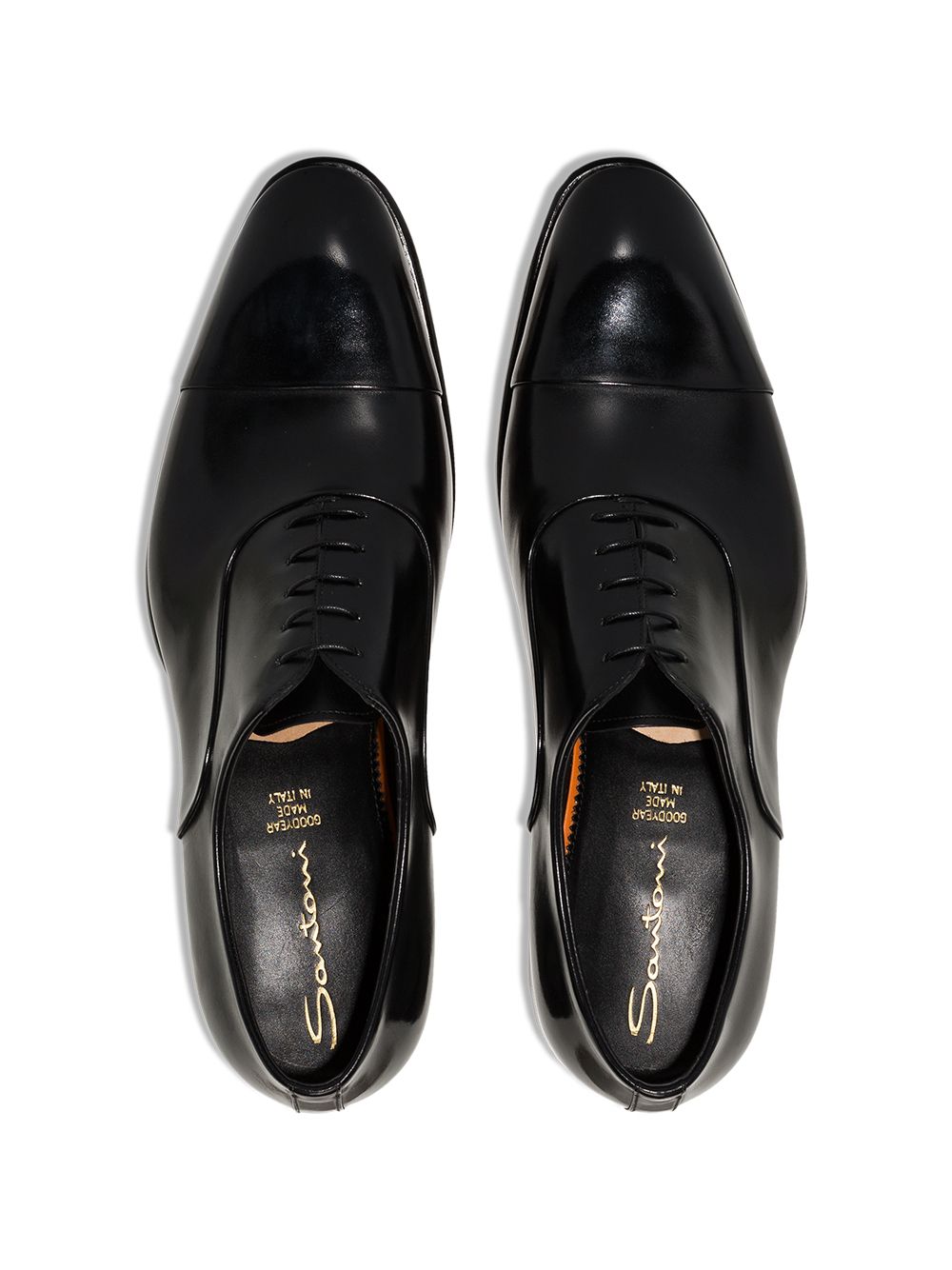 Santoni men's polished black leather Oxford shoes with a classic tapered silhouette. Featuring stitching on the toe , five-hole lace-up fastening, the iconic orange leather lining and a leather sole with half rubber heel.