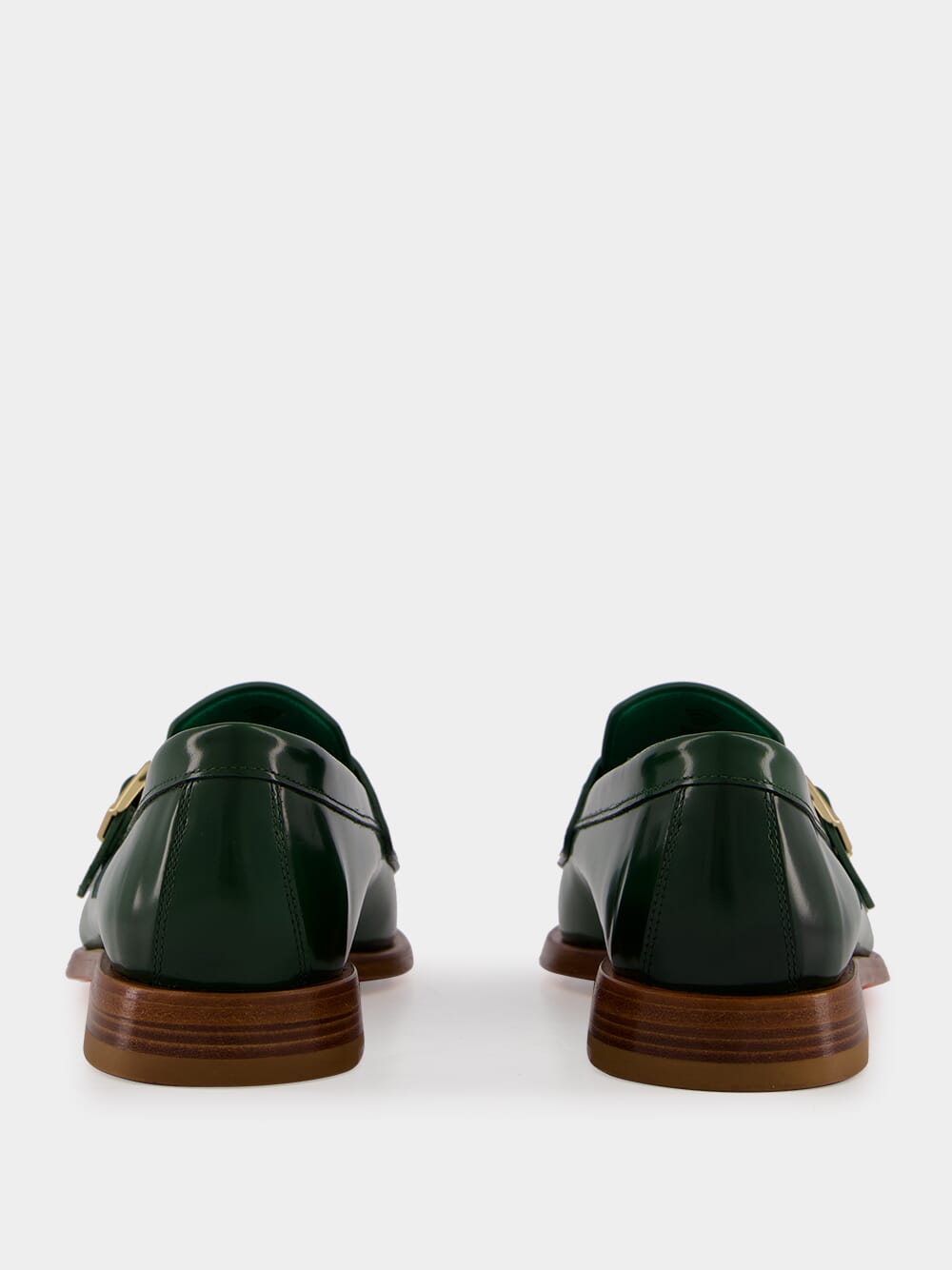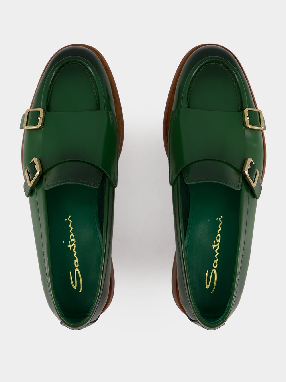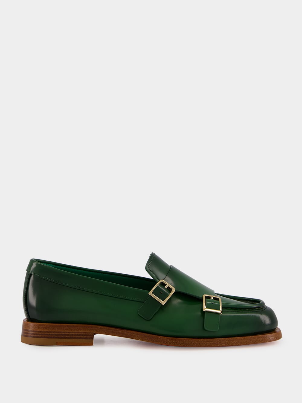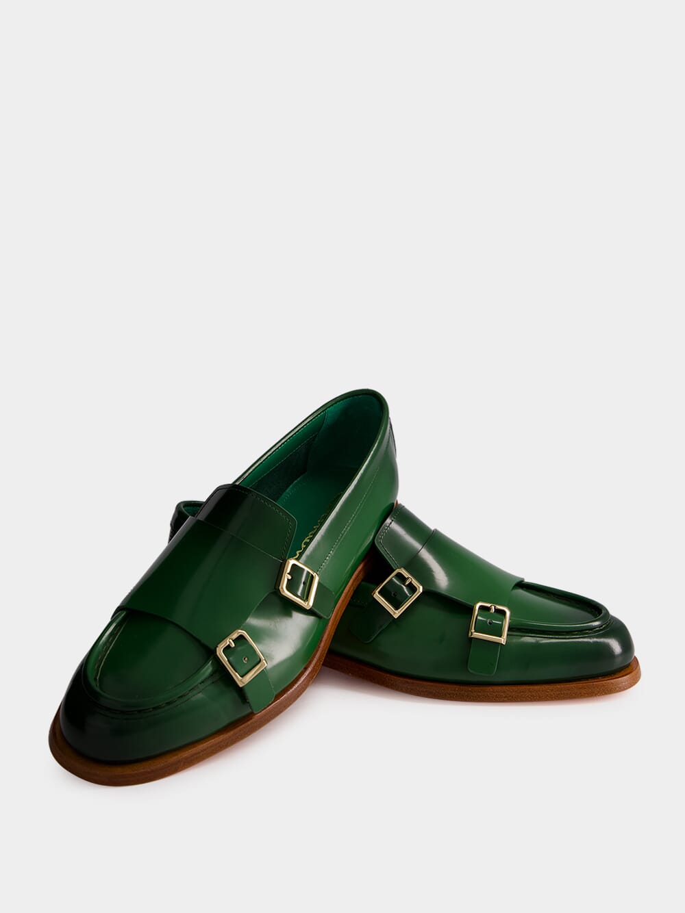 Elegant green leather loafers crafted from premium calf leather, featuring a double buckle detail for a refined look. The classic design and sleek silhouette make these loafers perfect for both formal and casual occasions. They offer a comfortable fit with a cushioned insole and a sturdy sole, ideal for all-day wear. A timeless addition to any wardrobe, they elevate any outfit effortlessly.
