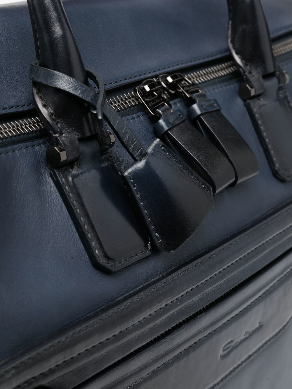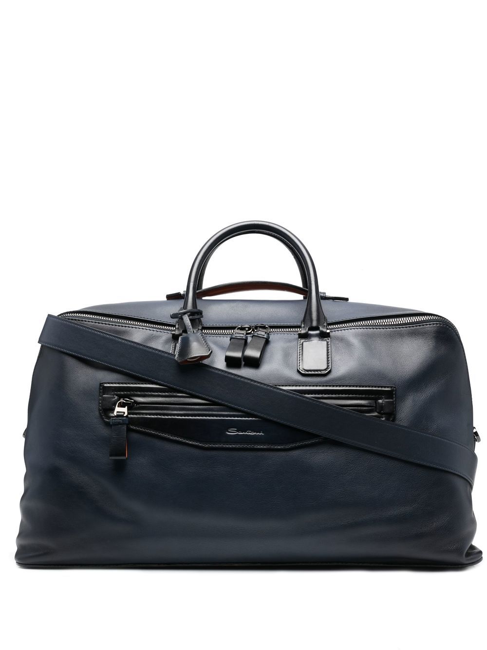 Santoni Weekend bag in polished leather with embossed logo on the front.