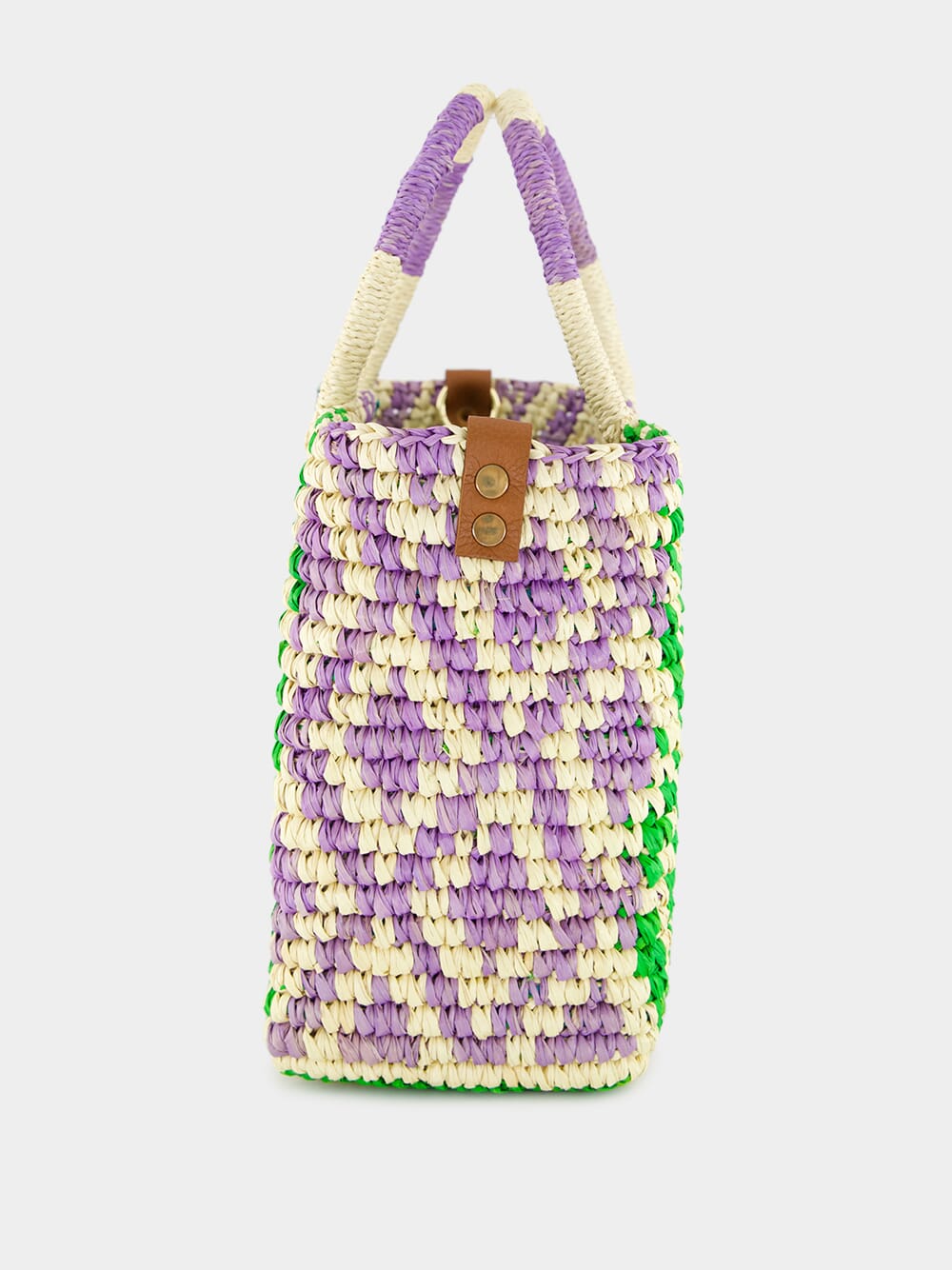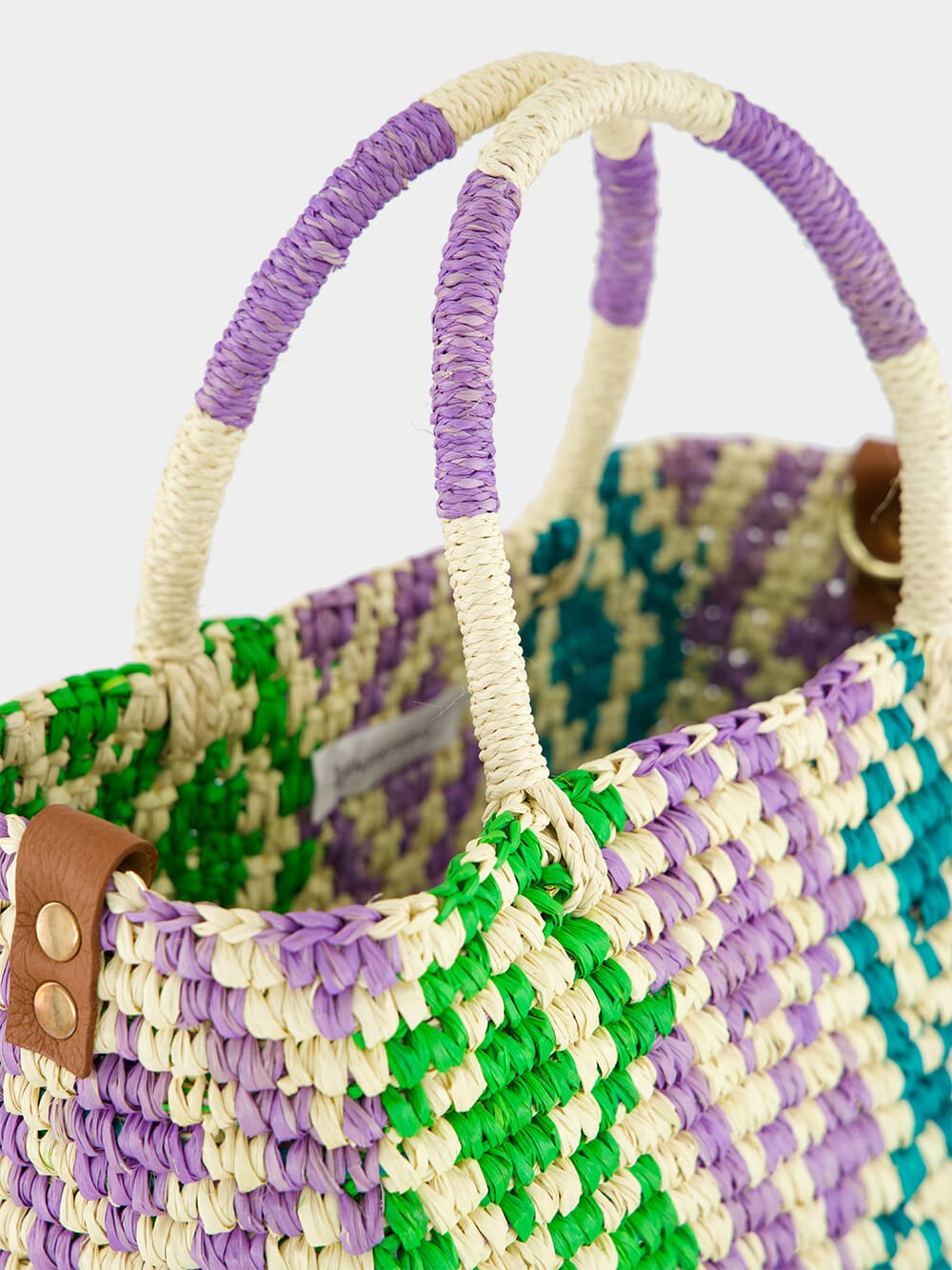 The Canasta Patterned Medium Handbag by Sensi Studio is a vibrant expression of artisanal craftsmanship. Handwoven from 100% Toquilla Straw, it showcases an intricate geometric pattern in natural, turquoise, lilac, and green hues. The structured silhouette is complemented by sturdy woven handles and a detachable camel-colored leather strap for versatile styling. Spacious yet lightweight, this bag is perfect for carrying everyday essentials with effortless elegance. A unique accessory that seamlessly blends tradition with contemporary charm.