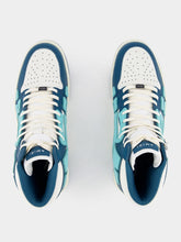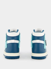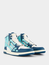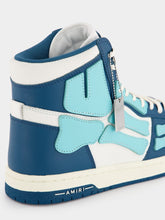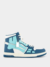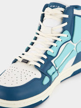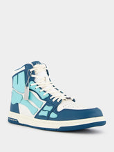 Skel High-Top Leather Sneakers, designed for both fashion and comfort. These ankle-length sneakers feature a prominent logo patch at the tongue and a front lace-up fastening for a secure fit. The round toe design ensures ample space for your feet, and the flat rubber sole offers excellent traction.