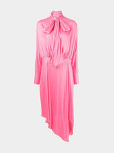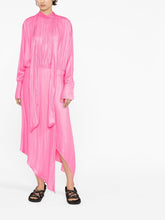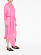 Stella McCartney long sleeves midi dress in pink fluid chintz featuring a high collar, pleated front and an asymmetric hem.