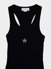 From the Stella McCartney x Selfridges capsule collection, this sleek black tank top shines with a rhinestone-outlined star, symbolizing the essence of the 'Stellabration'. It's a versatile and chic piece, perfect for pairing with low-rise jeans for a glamorous, star-studded ensemble.