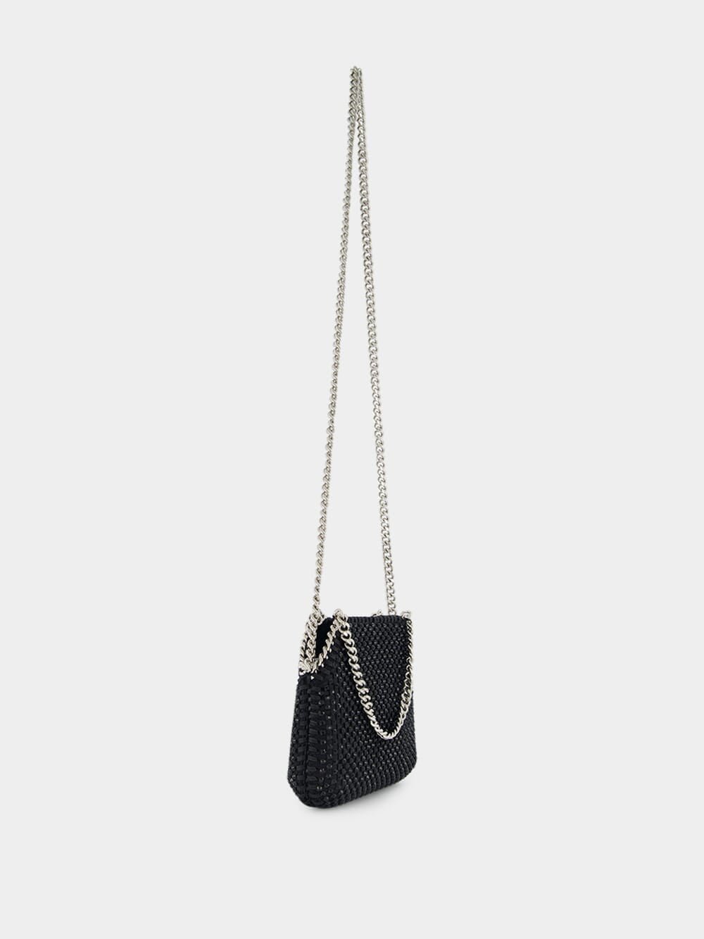 Falabella Mini Crystal-Embellished Shoulder Bag, a dazzling masterpiece that exudes luxury and sustainability. Crafted from smooth satin and adorned with a mesmerizing mesh overlay punctuated with crystals, this bag is a true statement of elegance. The signature chain trims add a touch of sophistication to its design. Emphasizing its commitment to eco-consciousness, the bag features certified organic cotton lacing and a fully recycled lining.