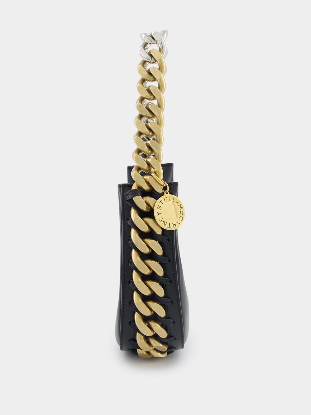 Frayme Mini Zipped Shoulder Bag, crafted with smooth Alter Mat, a luxurious vegan alternative to animal leather, this bag is both chic and ethical. The oversized signature silver and gold infinitely recyclable aluminium diamond-cut chain adds a touch of elegance to its design. It features a GOTS-certified cotton lacing, emphasizing its commitment to eco-consciousness. The bag offers convenient wear with one shoulder strap, and inside, you'll find a slip pocket for easy organization. The stainless steel magnetic snap fastening ensures secure closure, complemented by the engraved gold logo medallion charm. Fully lined, this Frayme Mini Zipped Shoulder Bag is a true embodiment of fashion and responsibility.