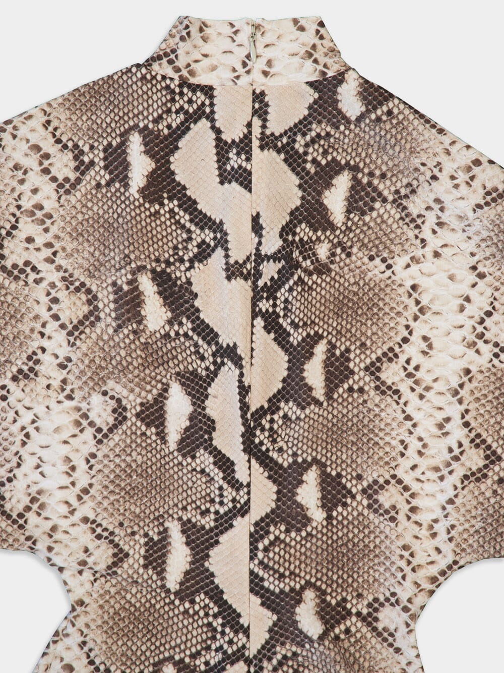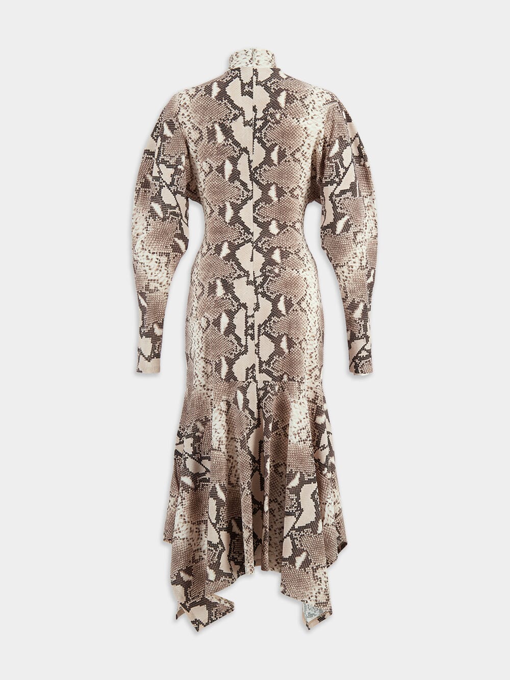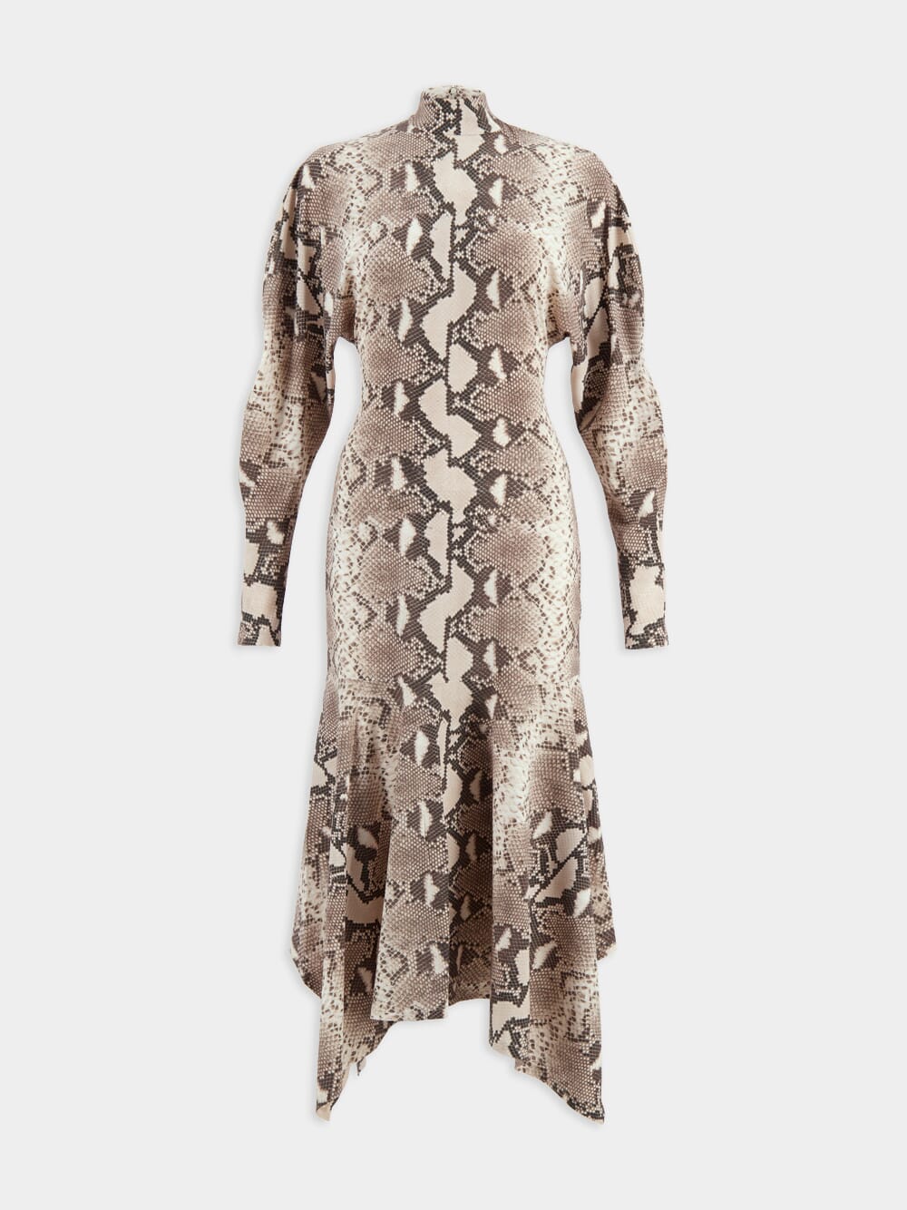 STELLA MCCARTNEY L/S Phyton Print Midi Dress, a captivating and chic garment in a stunning brown hue. This dress showcases a mesmerizing python print, adding a touch of exotic flair to your ensemble. Crafted with attention to detail, it features a flattering midi length and long sleeves, perfect for transitional seasons.