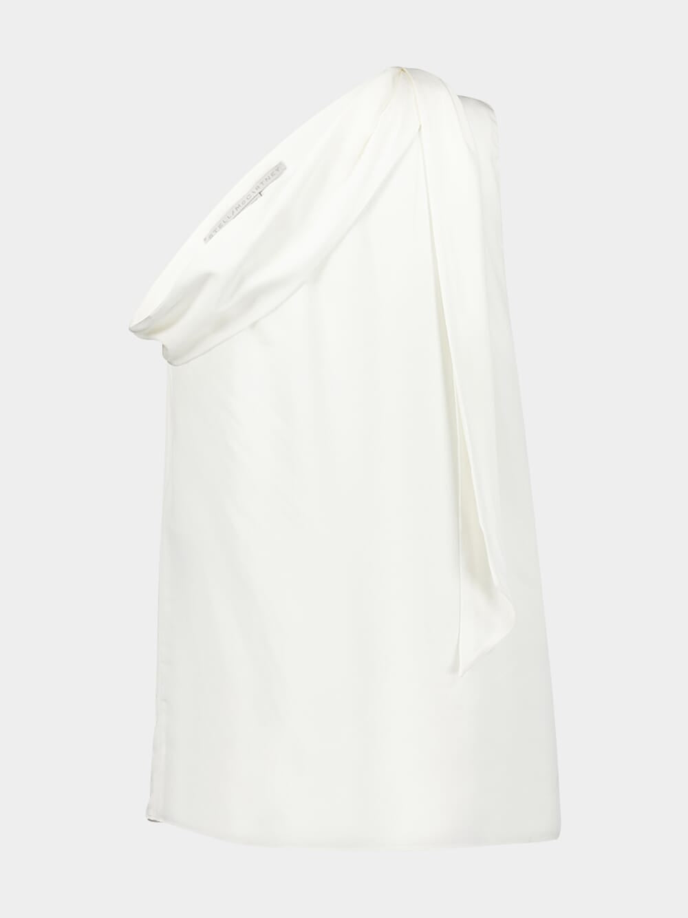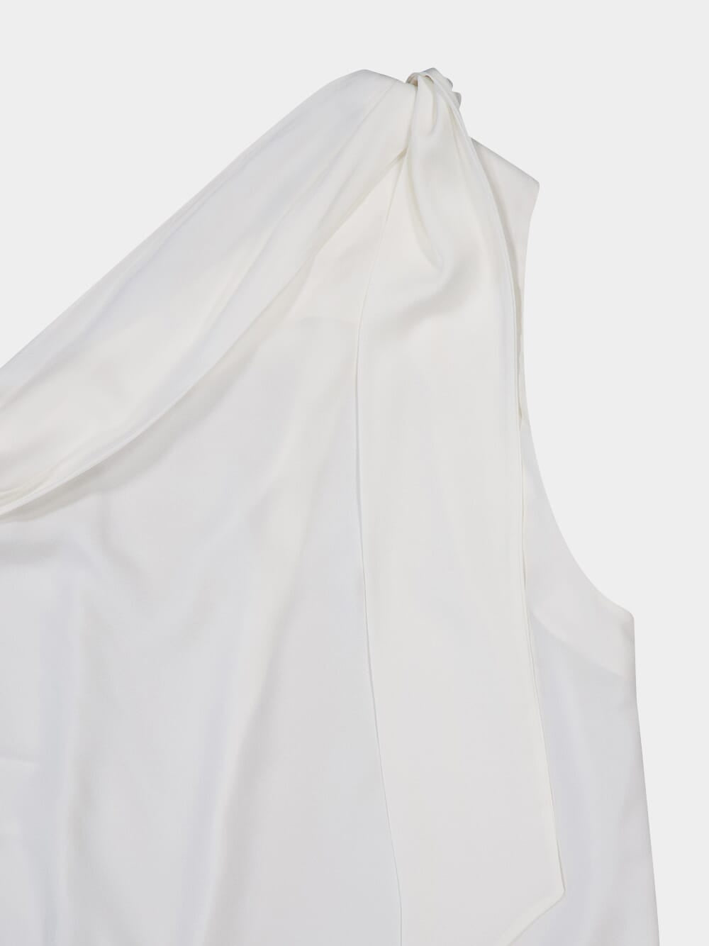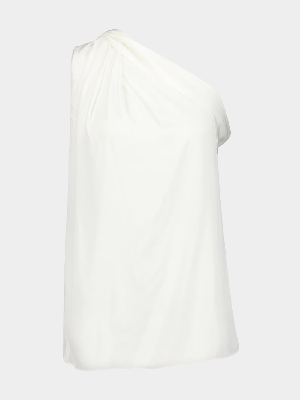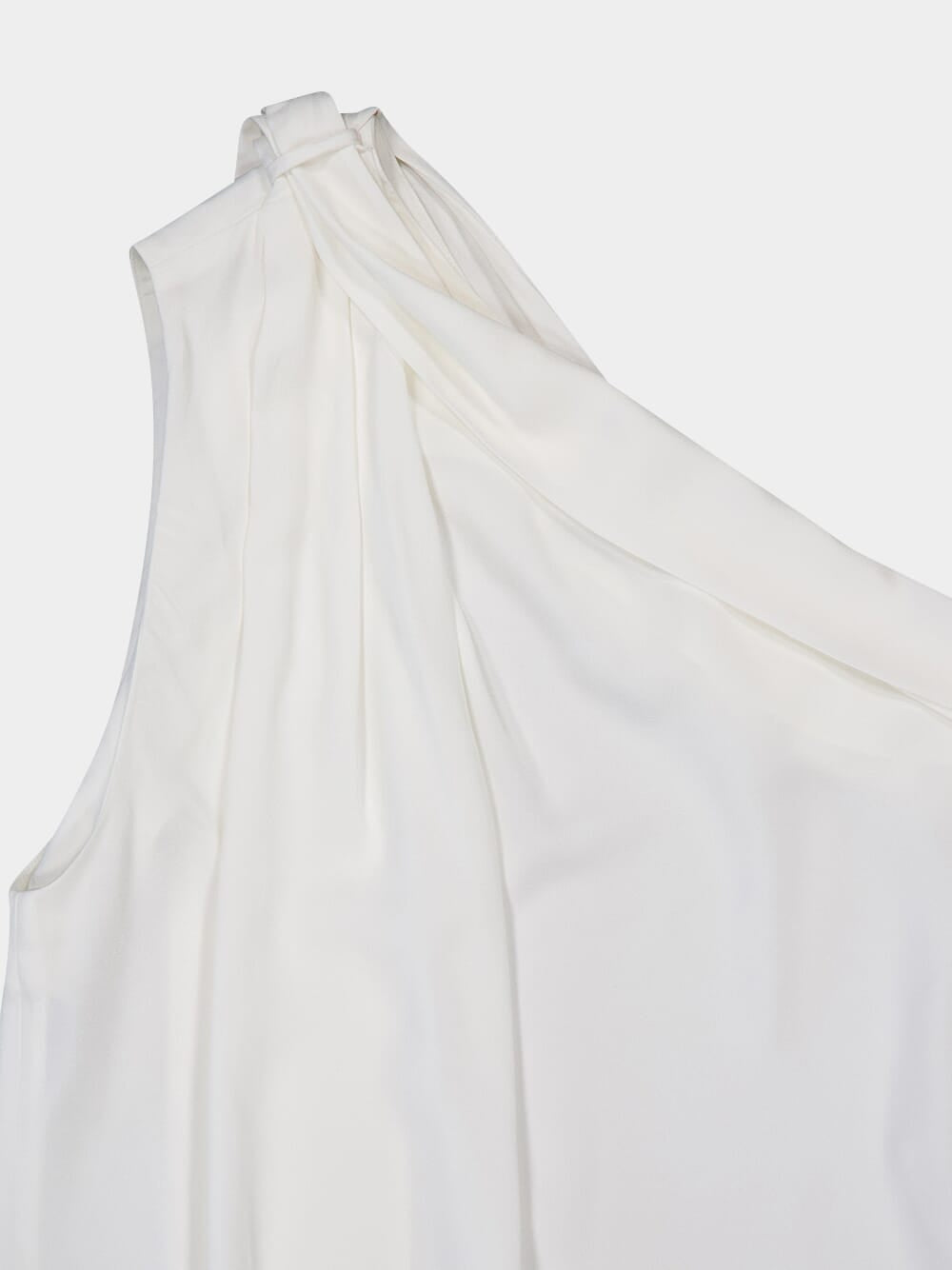 One-Shoulder Scarf Top, expertly crafted from forest-friendly viscose sable for a sustainable style statement. The alluring one-shoulder design exudes elegance, while the self-tie scarf at the neck adds a touch of sophistication. With a concealed side zip fastening, this top ensures a seamless fit and effortless wear.