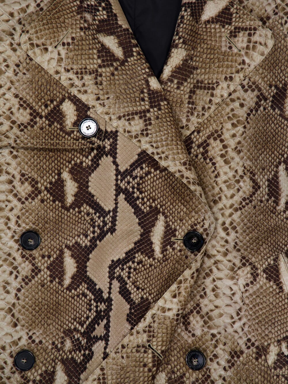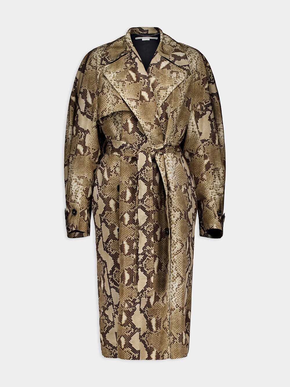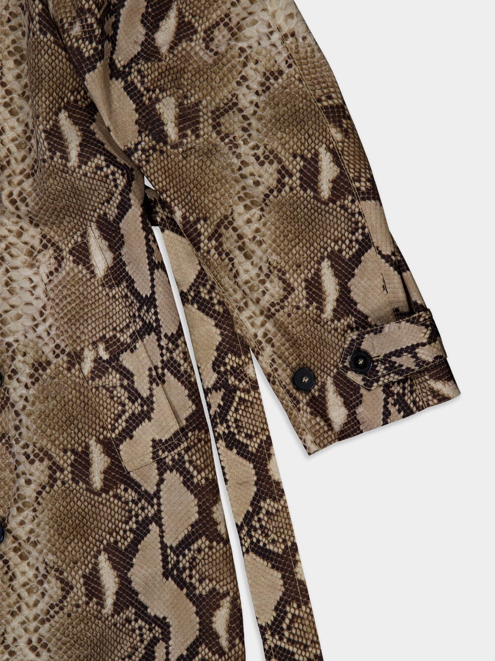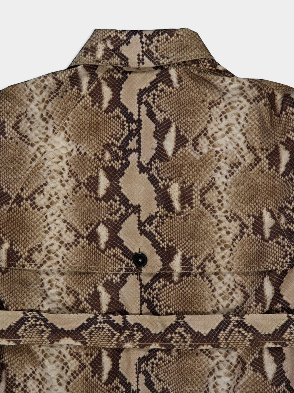 Python-Print Belted Trench, crafted with eco-consciousness in mind using recycled nylon. This trench coat boasts a captivating python print, blending the essence of nature and high fashion. With its classic notched lapels and double-breasted button fastening, it exudes sophistication and style. Embrace comfort and elegance with its long sleeves and two side slit pockets, providing both functionality and flair. Perfectly tailored to a flattering mid-length, this trench elevates your outfit for any occasion.