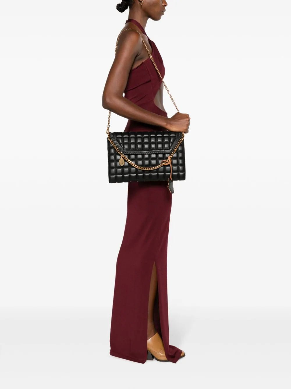 Quilted Crossbody Bag, a chic essential crafted from luxe faux leather. Featuring a signature diamond-cut chain-link trim and a versatile chain-link shoulder strap, this bag effortlessly combines style with practicality. The foldover top with a magnetic fastening reveals a spacious main compartment, complete with an internal zip-fastening pocket and a sleek logo patch.