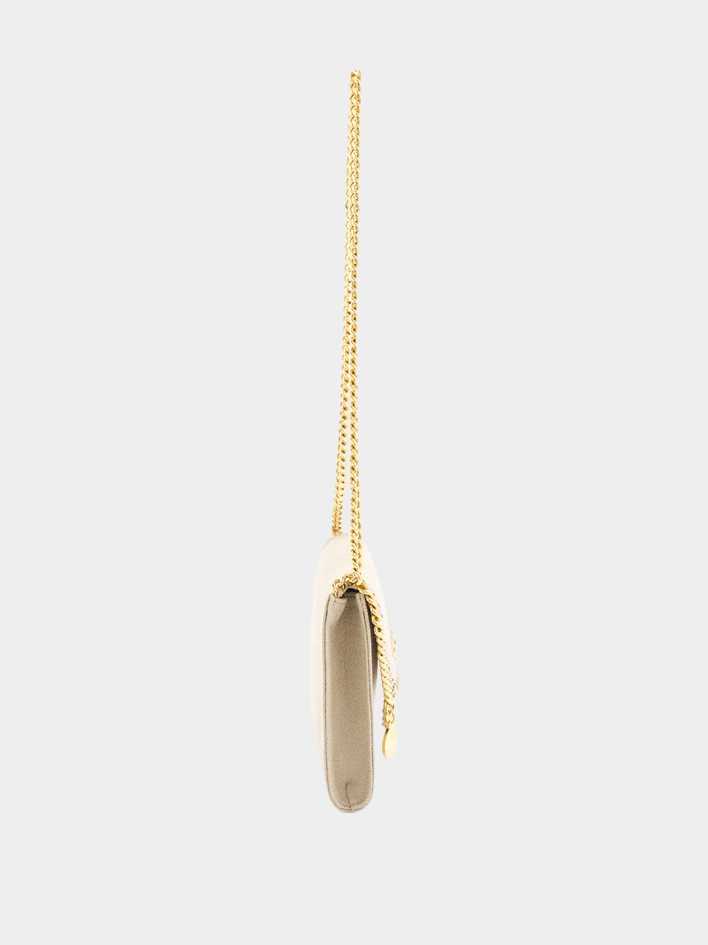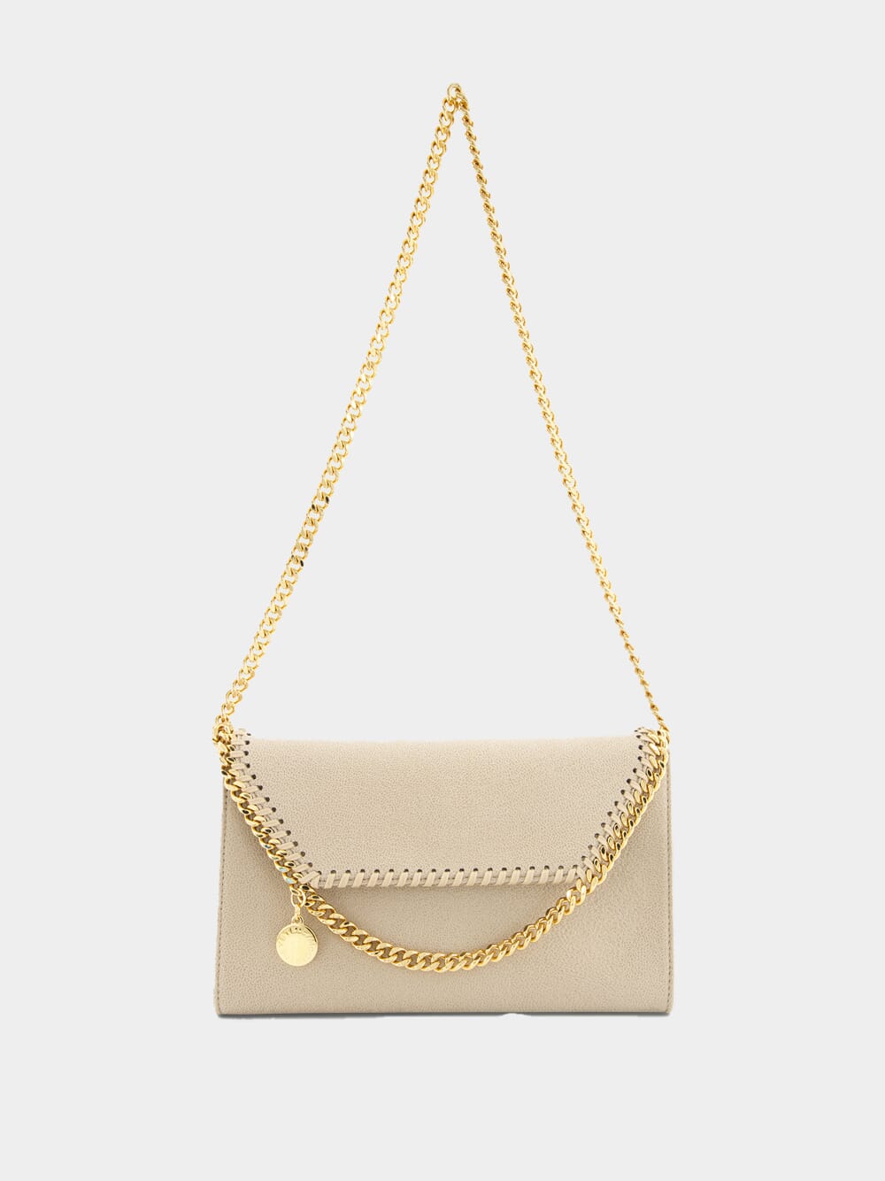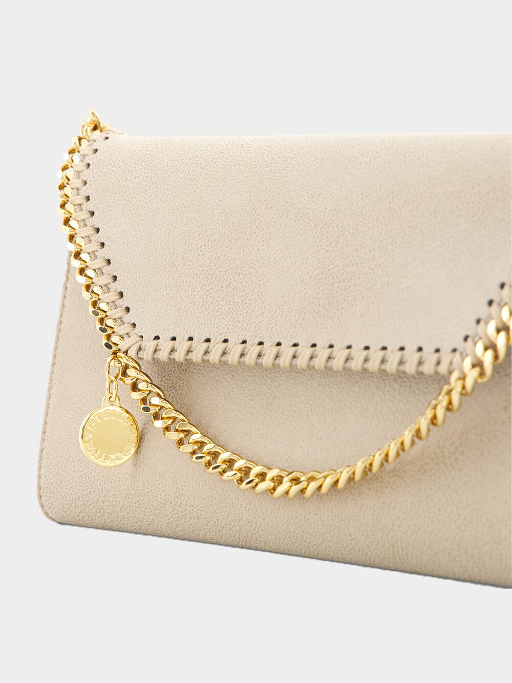 Stella McCartney Falabella mini Shoulder bag in butter cream with signature gold recycled brass and aluminium diamond-cut chain. Made with a grained vegan Shaggy Deer fabric, with flap front, shoulder strap and one top handle with one internal slip pocket and magnetic snap fastening. This bag is lined with recycled materials