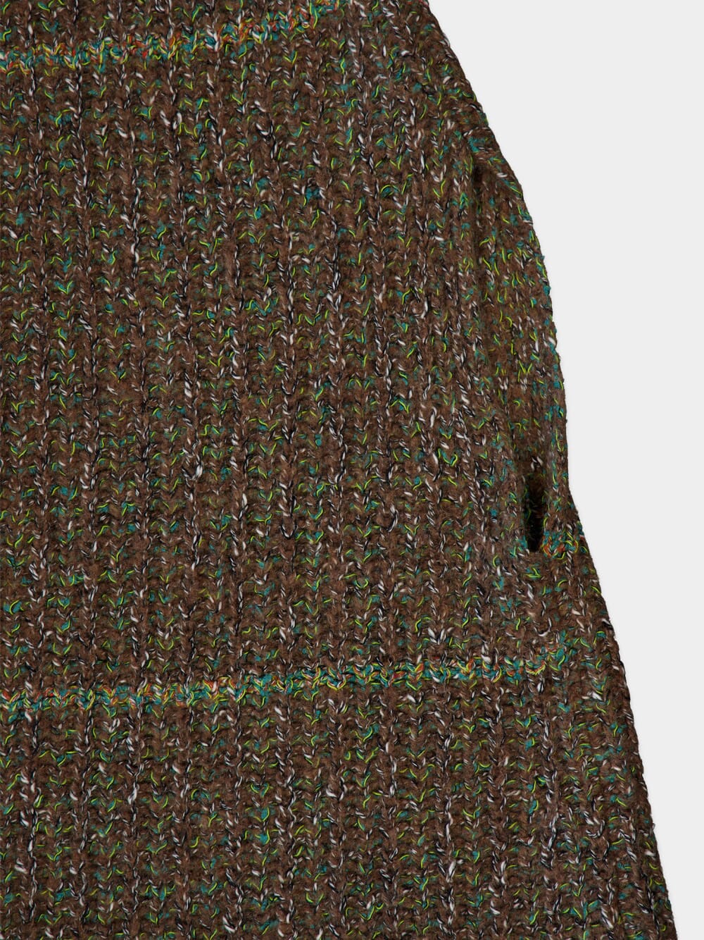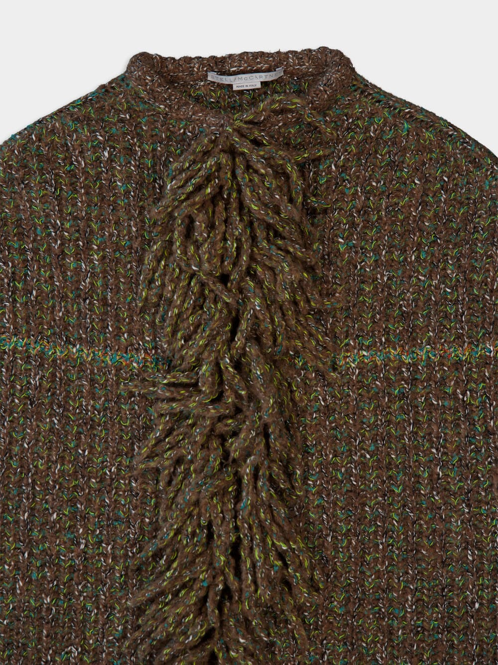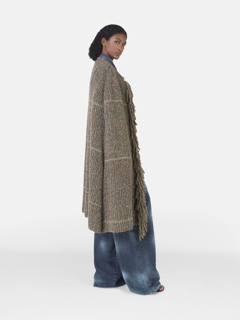 Tweed knit cape coat, crafted with an exquisite blend of organic cotton, recycled cotton, and forest-friendly viscose. This coat offers unmatched comfort and eco-conscious style. Its fringed front detailing adds a touch of sophistication, while the crew neck and deep armholes ensure a cozy fit. With a concealed button fastening at the collar and two front slant pockets, this coat combines functionality and fashion effortlessly.