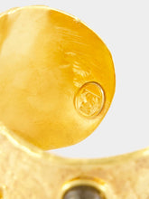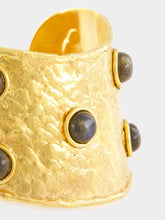 The Gold Flow II Labradorite Cuff Bracelet is a luxurious statement piece crafted from golden brass with an artisanal hammered finish. This wide cuff features labradorite stones that add a captivating iridescent effect to the textured gold. Perfect for adding elegance to any look, this bracelet combines artistry and sophistication, making it ideal for both casual and formal occasions.