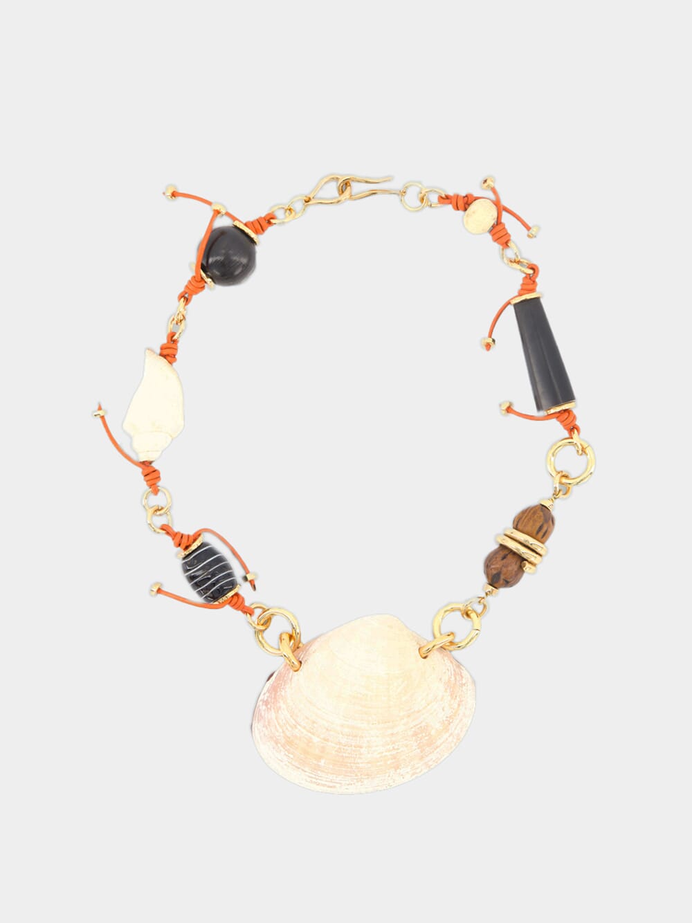 Samsara III necklace, an exquisite masterpiece meticulously handcrafted by skilled local artisans in our esteemed Istanbul Ateliers. This captivating necklace features natural elements with delicate shells and elegant gold plated details, epitomizing the perfect blend of artistry and nature. Elevate your style with its unique design, destined to make a statement and elevate any outfit.