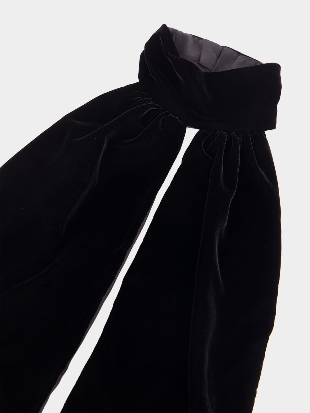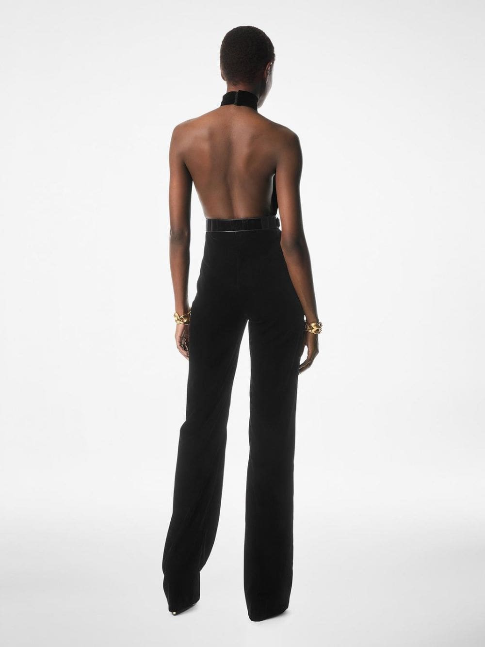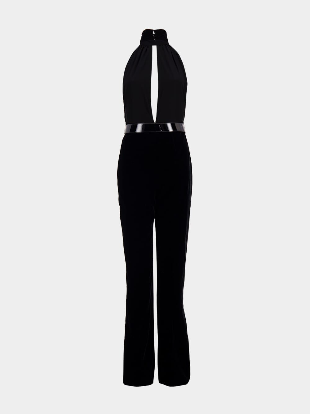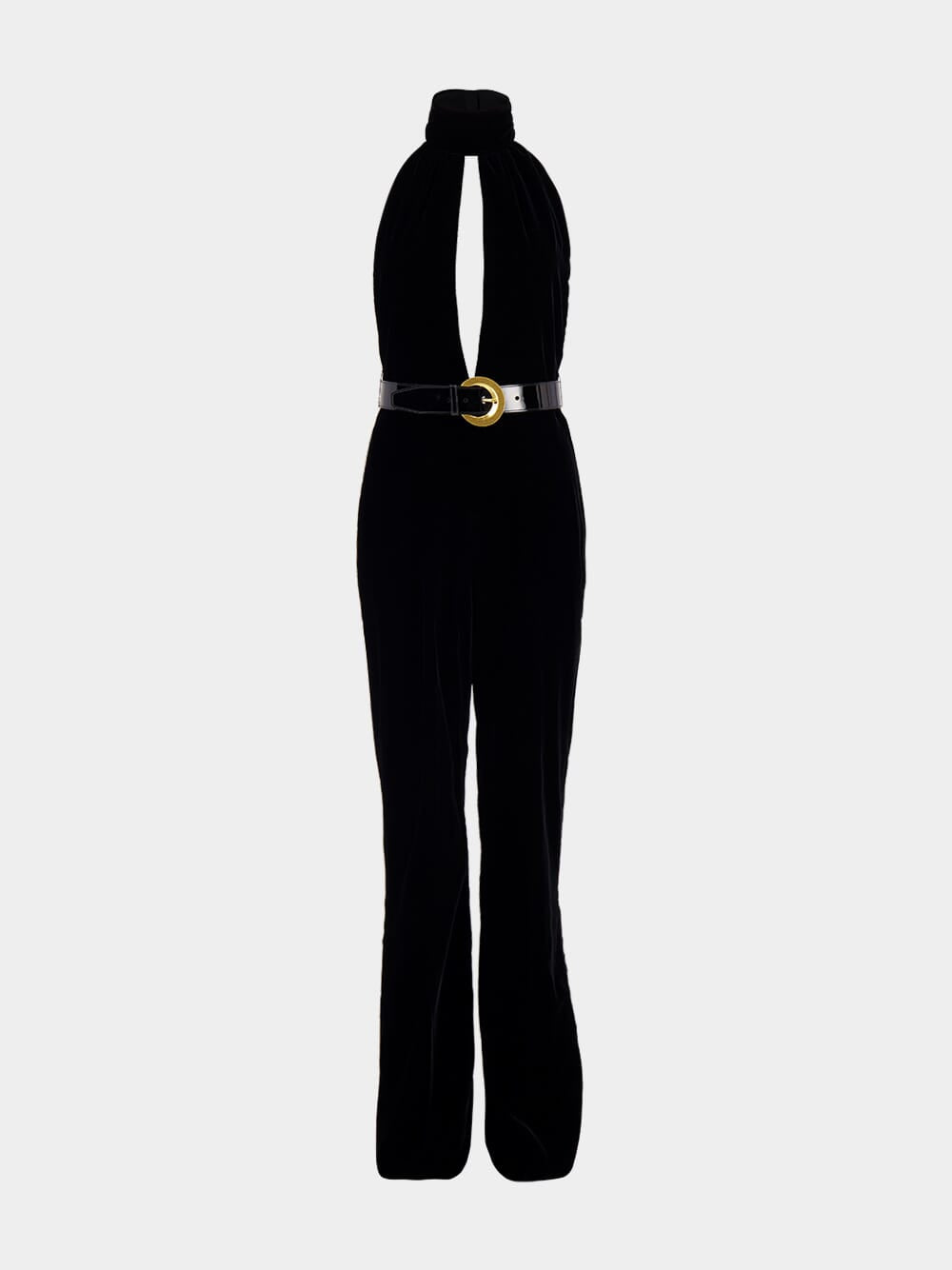 This black stretch velvet jumpsuit features a halter neck with a back hook closure and a concealed back zip. It includes a faux patent belt with a gold-tone buckle for a sleek silhouette. Made in Italy, the jumpsuit is lined and crafted from a luxurious blend of viscose, cupro, and elastane.