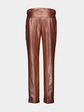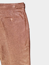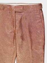 These iridescent mid-rise tailored trousers are a striking addition to any wardrobe. Featuring a glittery powder pink hue and an iridescent effect, they offer a luxurious and glamorous look. The tailored cut, straight leg, and mid-rise design ensure a flattering fit, while the concealed front fastening adds a sleek finish. Practical details include two side slit pockets, two rear button-fastening pockets, pressed crease, and turn-up hem. Perfect for making a statement at any event.