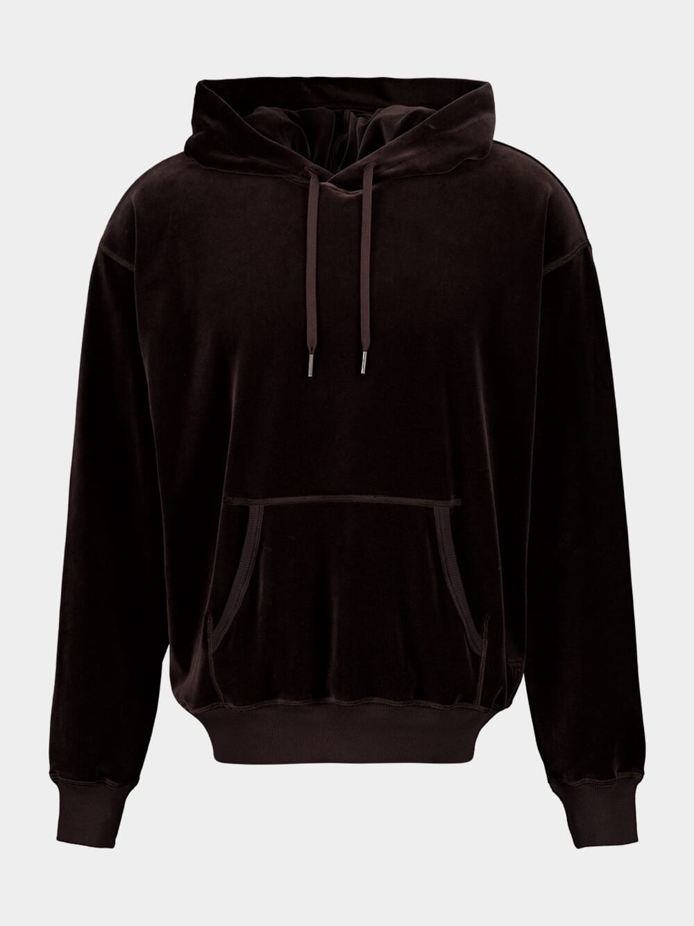 Luxurious jogger-style trousers crafted in soft velour in a rich dark cocoa tone. Designed with a drawstring waistband, ribbed cuffs, and subtle vertical seam detailing for a structured yet relaxed fit.