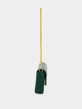The Wallis Mini Bag in emerald green shiny stamped crocodile leather is an elegant statement piece. Featuring a bold T-shaped metal closure with an engraved logo, this bag exudes modern sophistication. The detachable gold-tone chain strap allows for versatile styling, whether carried by hand or worn over the shoulder. The compact yet functional design includes a single compartment and an internal credit card slot. Crafted from 100% calfskin with a leather lining, this exquisite accessory is a luxurious addition to any ensemble.
