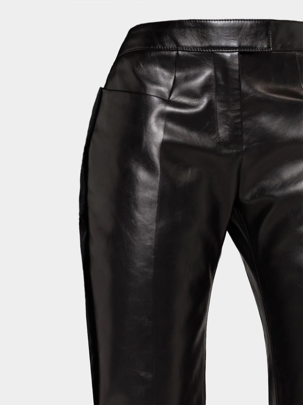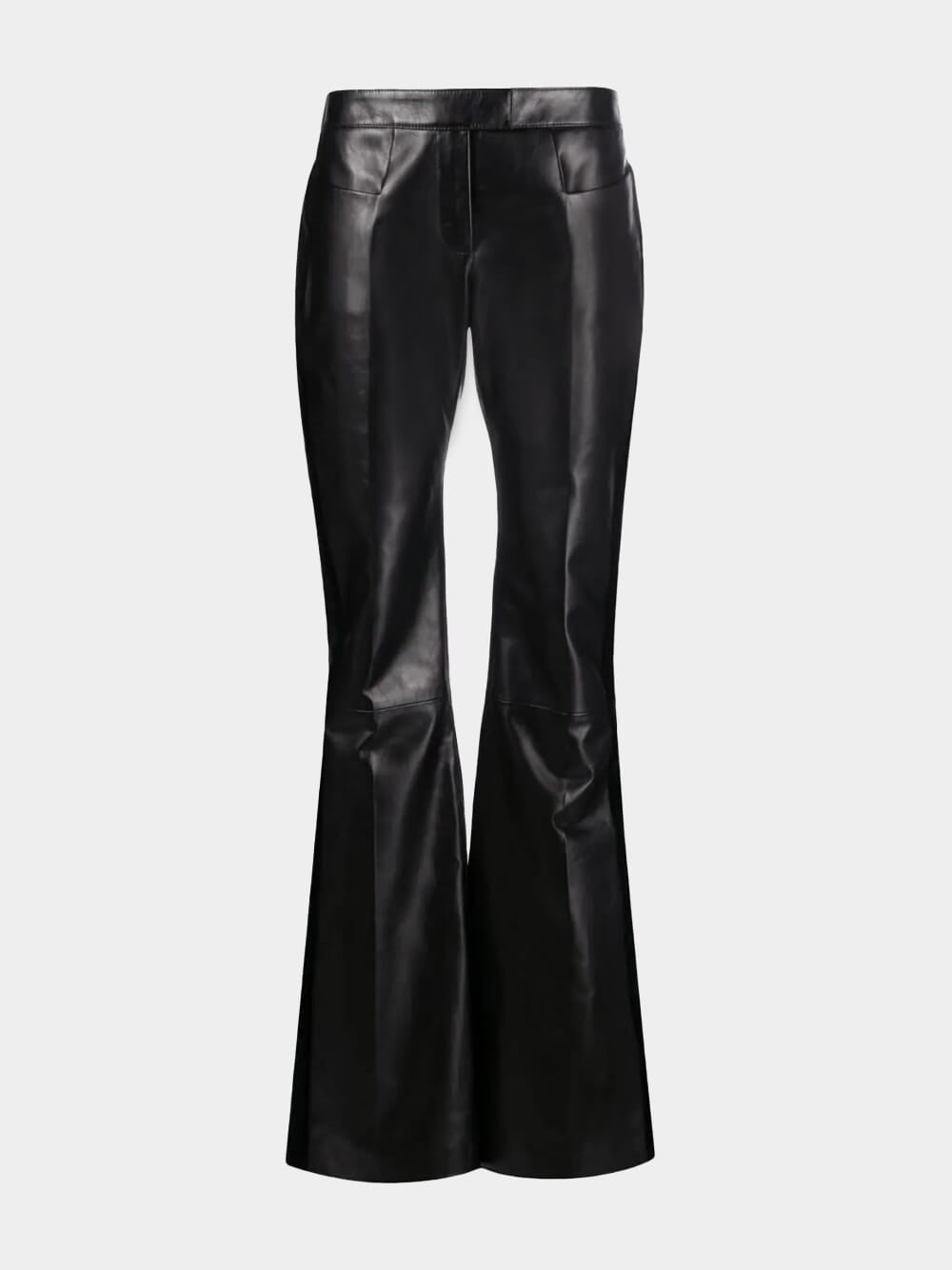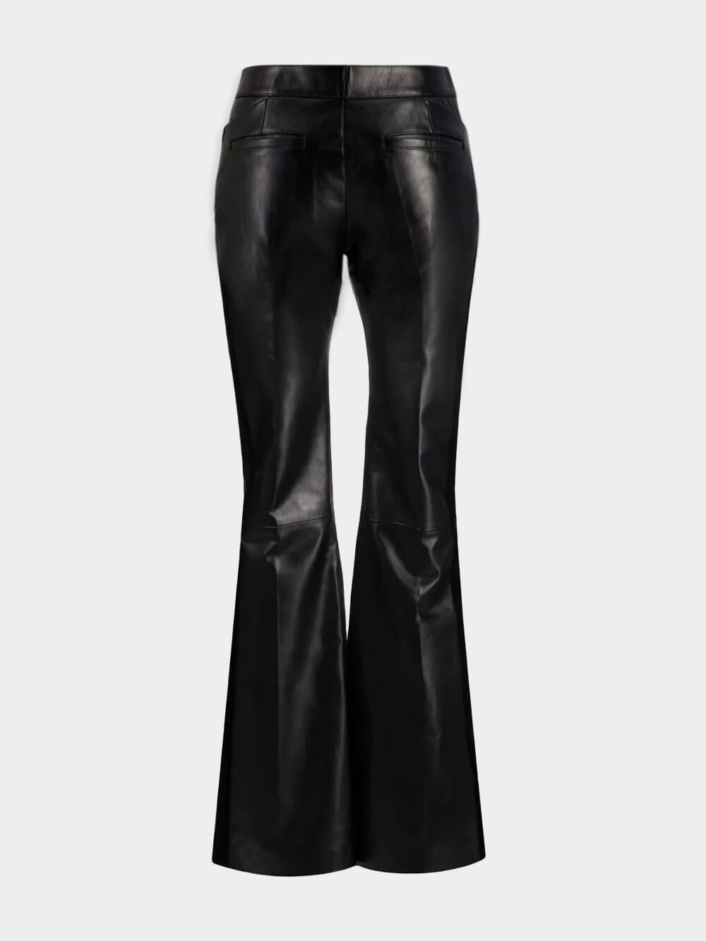 Flared Leather Trousers, meticulously crafted from exquisite calf leather and featuring a luxurious silk-blend lining. These trousers offer a sleek, concealed front fastening, along with two rounded pockets to the sides and two rear welt pockets for practicality and style. The pressed crease detail enhances the tailored look, while the trendy flared design adds a modern twist.