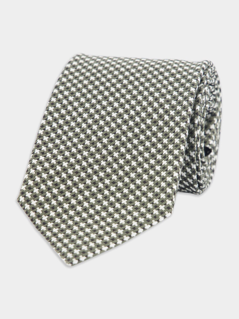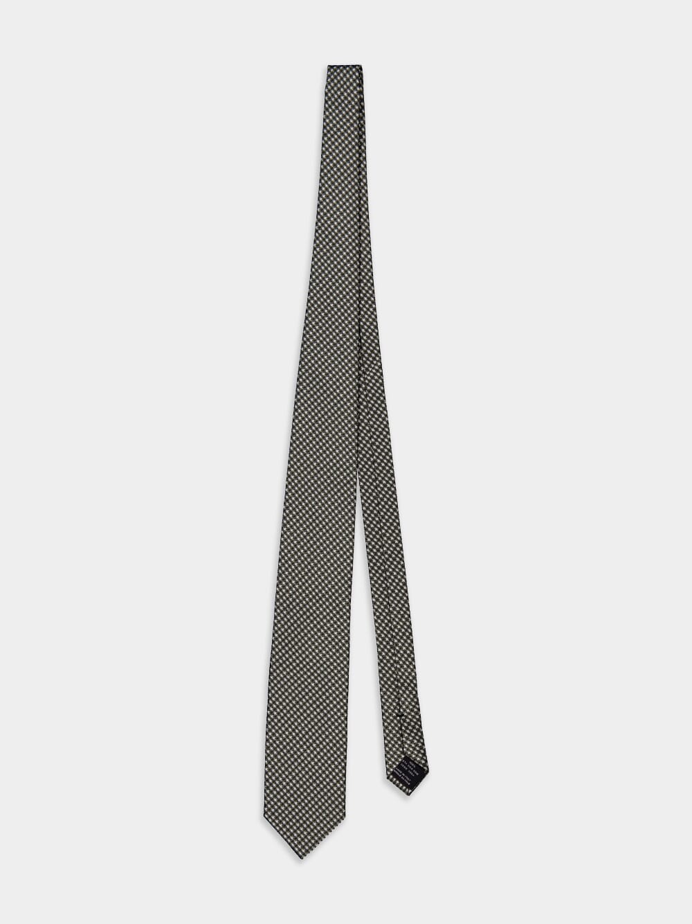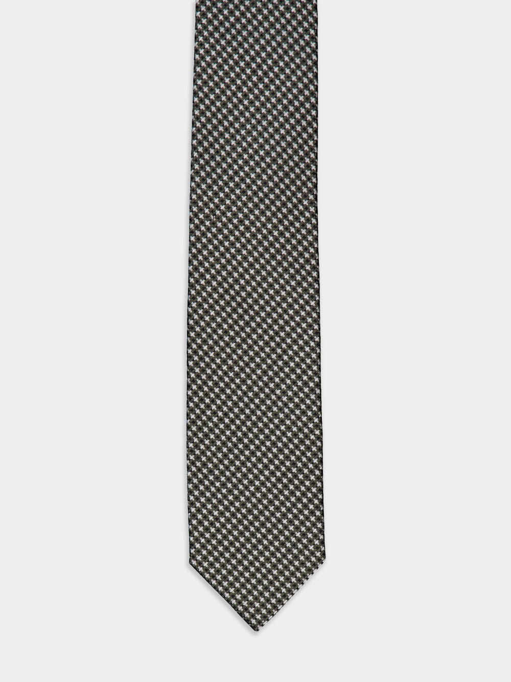Geometric Motif Silk Tie crafted from premium silk, this tie exudes luxury and refinement. The contrasting black and white hues, optimized for sophistication, beautifully accentuate the intricate geometric pattern, adding a touch of elegance to your ensemble. Elevate your look with this versatile accessory, suitable for any occasion, from formal gatherings to casual events.