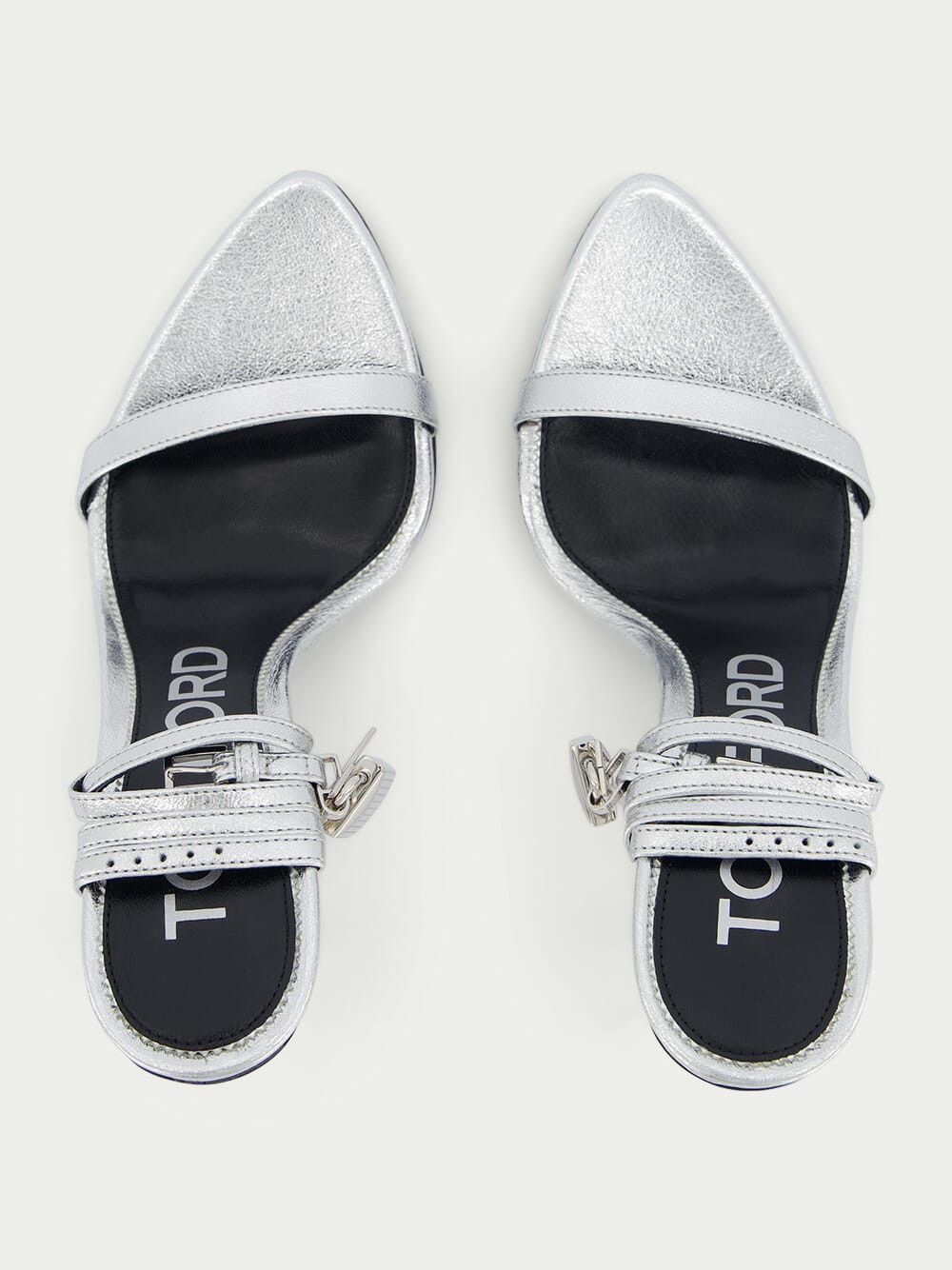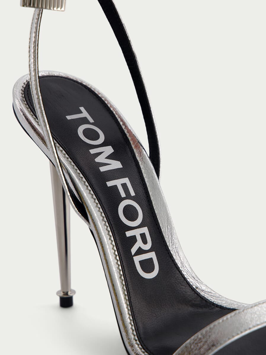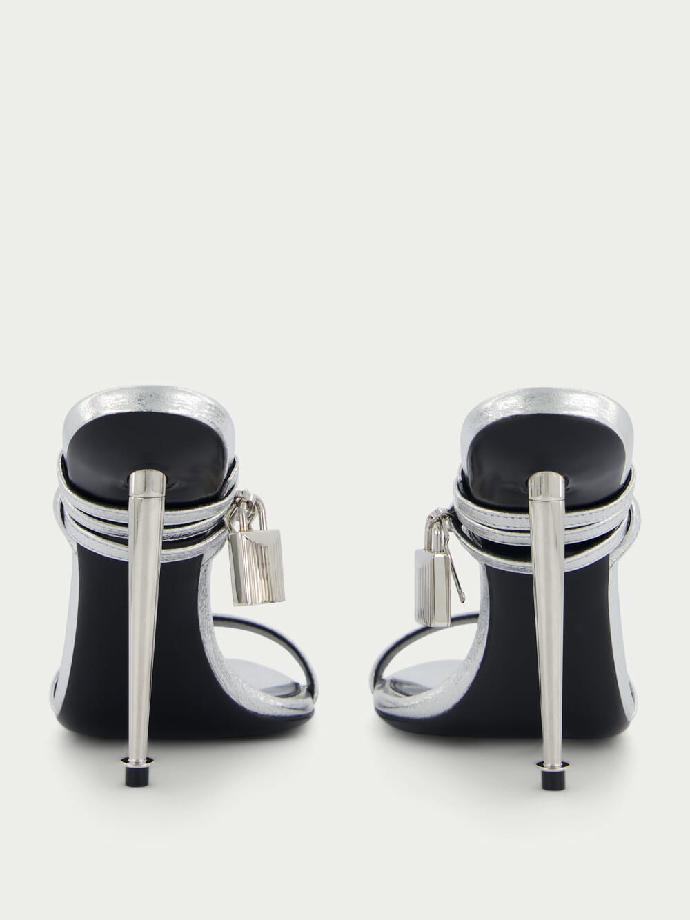 Padlock-Detail Sandals, feature a striking metallic finish, adding a touch of glamour to any outfit. The padlock detail on the buckle-fastening ankle strap exudes sophistication. With an open toe design and branded insole, these sandals offer comfort and style in one.