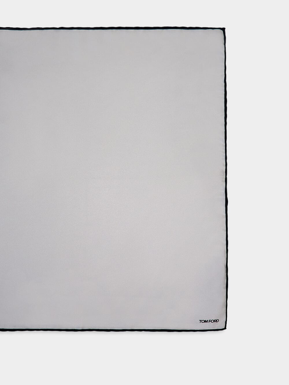 Tom Ford white silk pocket square contrasting with black border and logo in the bottom right corner.