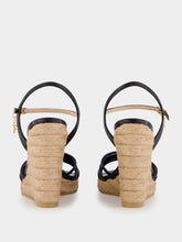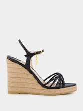 These stylish wedge espadrilles feature a black printed lizard leather upper, complemented by an 85 mm jute wedge. The round toe shape, TF charm, and buckle-fastening ankle strap add a touch of luxury. The nude leather lining and insole offer comfort, while the rubber sole ensures durability. Perfect for summer outings and elegant casual wear.