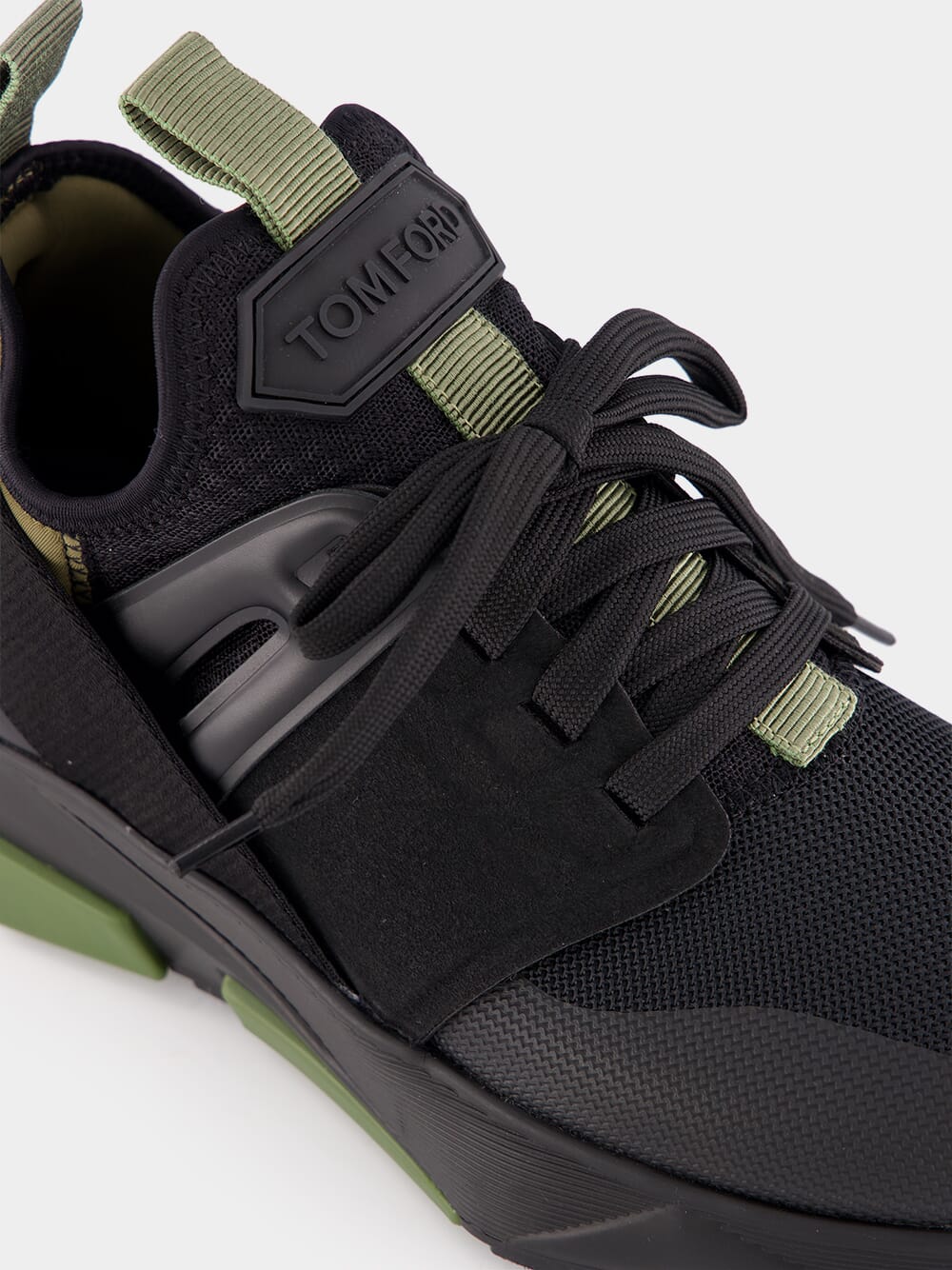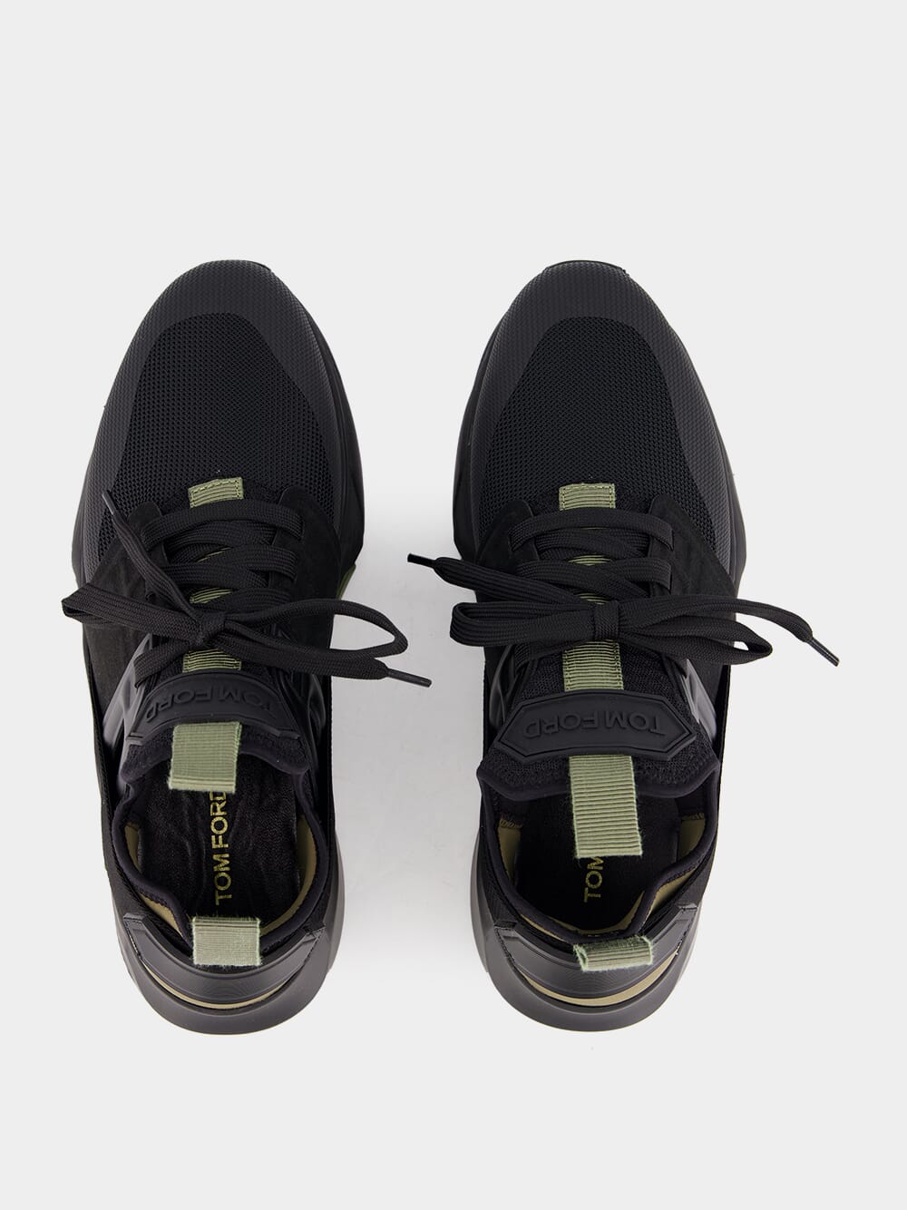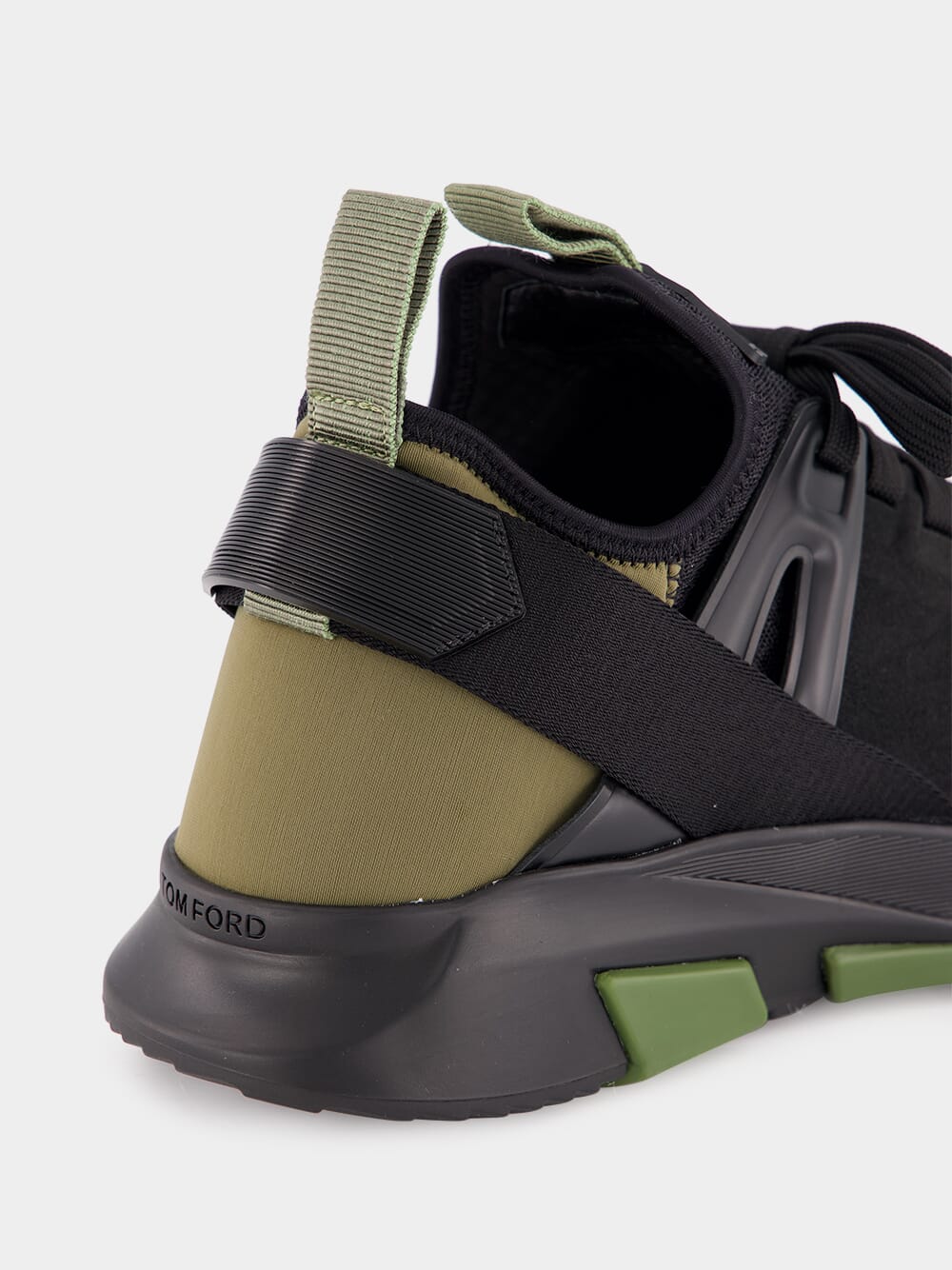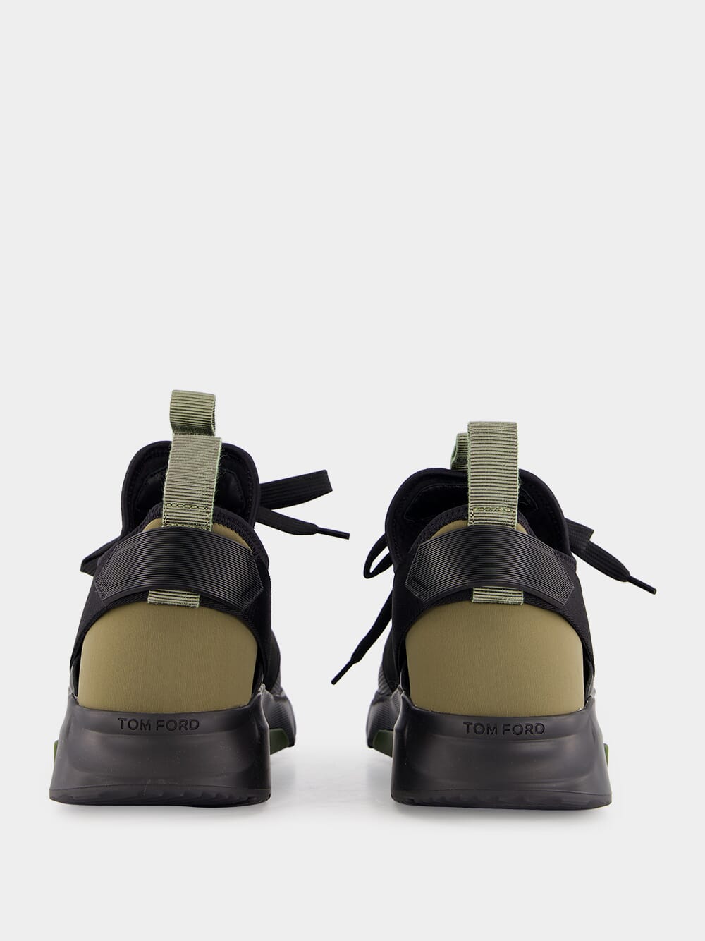 Step into contemporary style with these trendy black and military neoprene sneakers. Designed with a 'sock' opening and grosgrain loops for a sleek fit, these sneakers offer both comfort and a futuristic look. The upper is crafted from multi lightweight nylon sections, ensuring breathability and durability. The Tom Ford logo lozenge at the front adds a touch of luxury branding, while the sole is constructed using artisanal injected moulding techniques for superior support and grip. Perfect for urban adventures, these sneakers run slightly large, so consider sizing down half to a full size for the best fit.