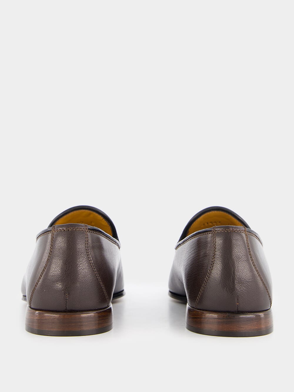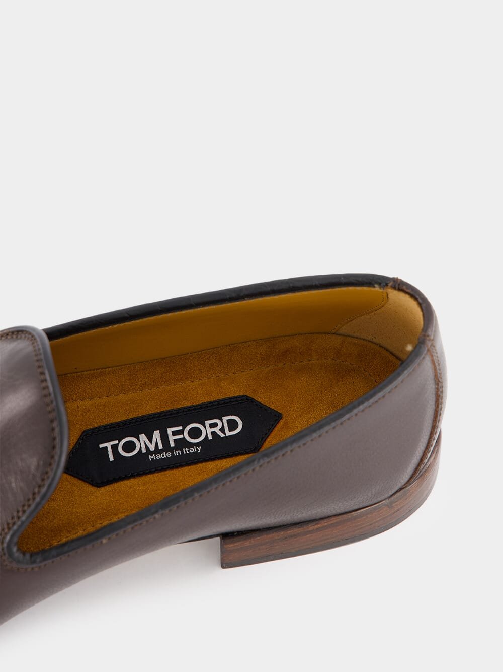 Introducing Tom Ford's sophisticated brown leather loafers, adorned with tassel details for a touch of refinement. Made from premium calf leather with a smooth grain, these loafers feature an elegant almond toe and a convenient slip-on style. Complete with a branded leather insole for comfort and a flat leather sole for a sleek finish. Ideal for those seeking both style and ease in their footwear.