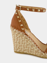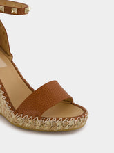 The Valentino Garavani Double Rockstud wedge sandals combine elegance and comfort. Crafted in grainy calfskin with an elk-print texture, they feature platinum-finish studs, a tonal ankle strap, and a woven rope sole. Perfect for summer styling.