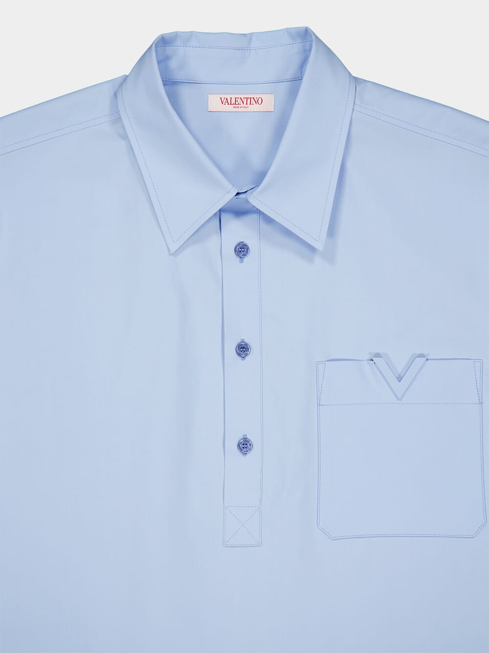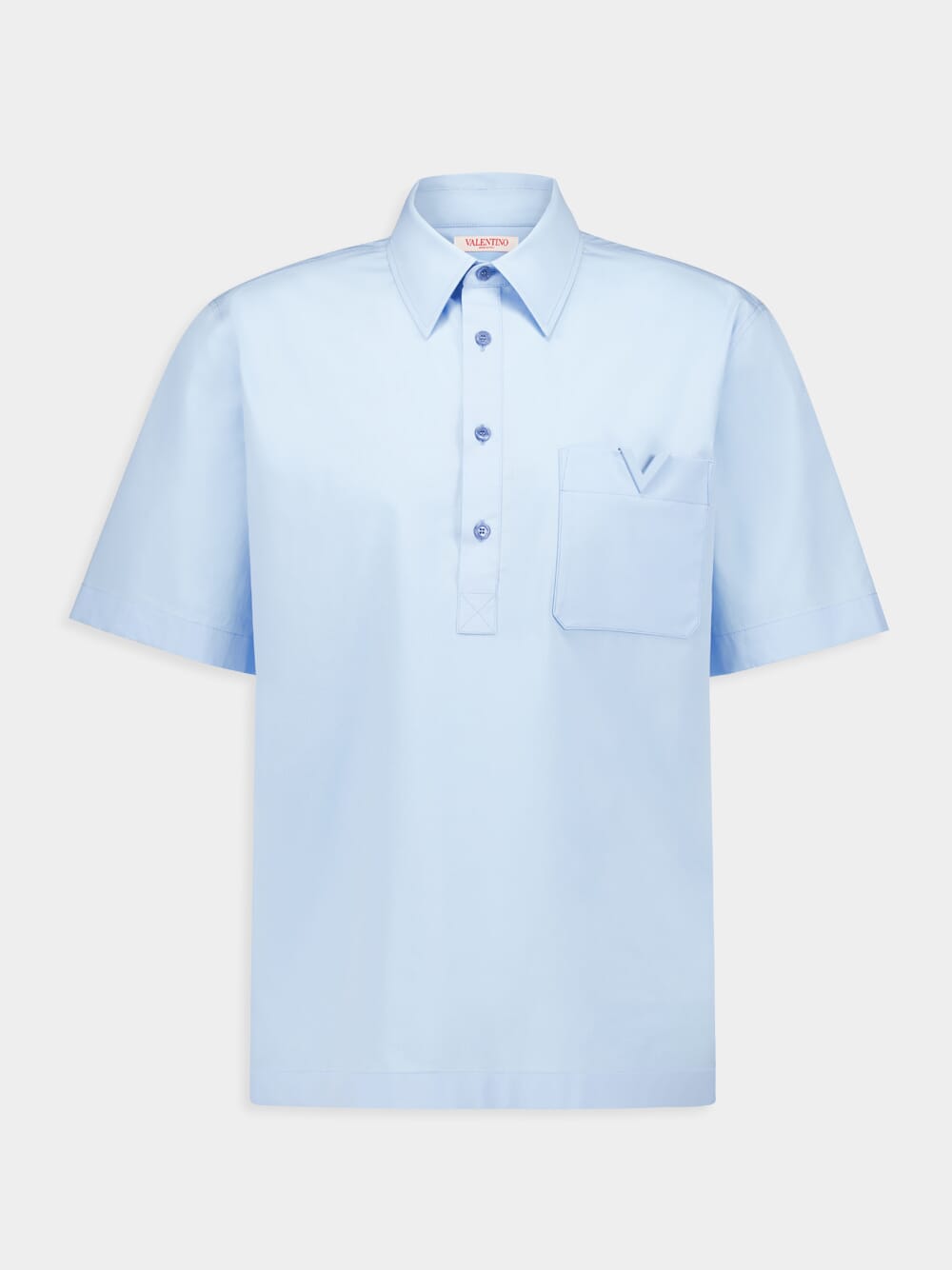 This refined light blue cotton shirt features a minimalist design with short sleeves and a classic collar. The front button placket adds a touch of sophistication, while the chest pocket enhances its practicality. Perfect for summer, this shirt provides a clean and crisp look suitable for both casual and semi-formal occasions. The lightweight cotton fabric ensures comfort and breathability, making it an essential addition to your warm-weather wardrobe.