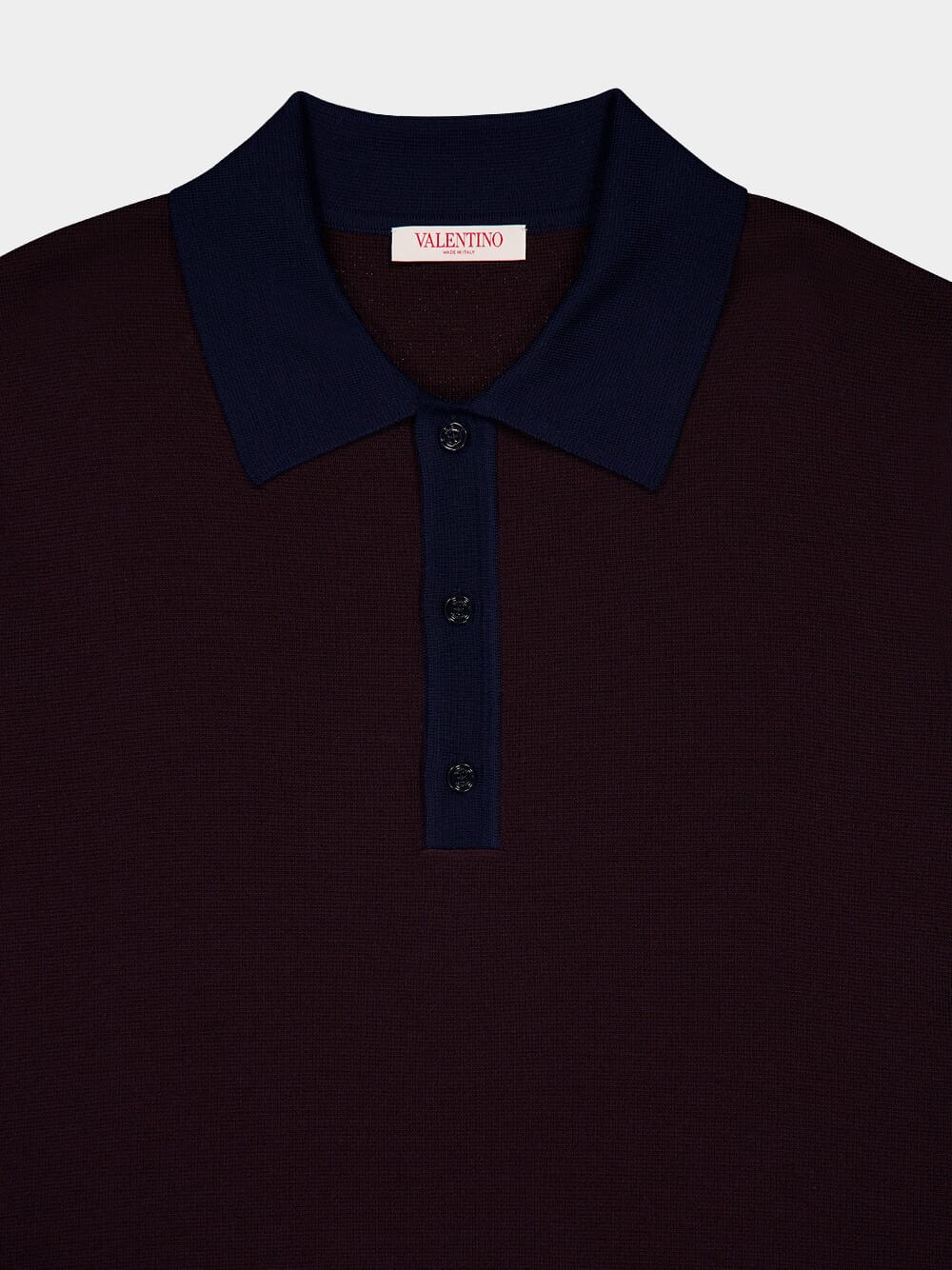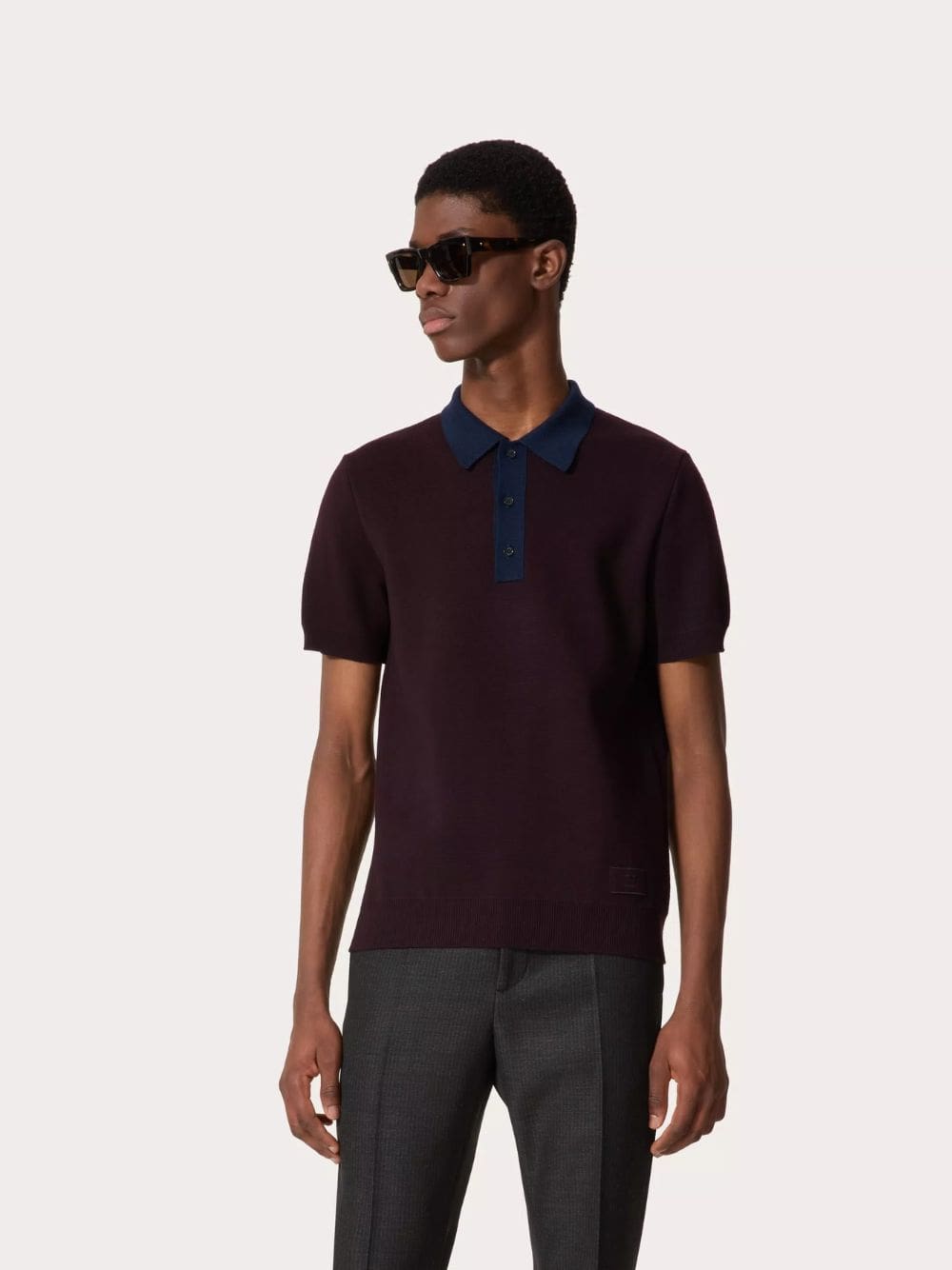Elevate your wardrobe with this elegant wool polo shirt from Valentino. Crafted from luxurious 12-gauge knit wool, this polo shirt features a sophisticated maroon and navy color combination. The design includes a ribbed collar and cuffs, adding a touch of refinement. The iconic VLogo Signature embroidery at the bottom adds a subtle yet distinctive branding element. With its regular fit, this polo shirt is perfect for both casual and semi-formal occasions, offering comfort and style in one timeless piece.