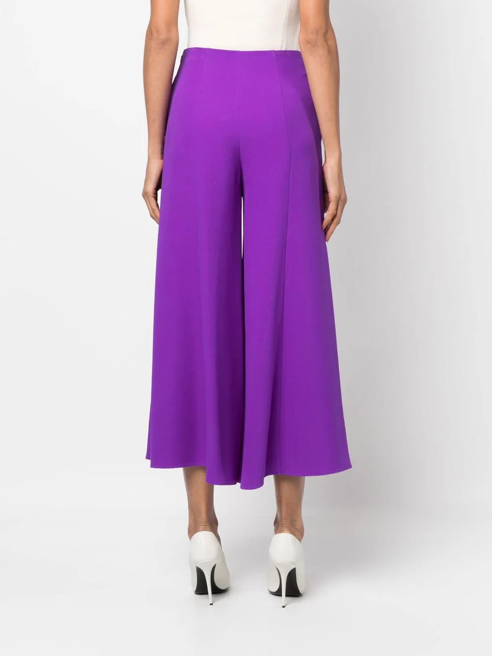 Cropped Flared Silk Trousers in a captivating violet purple hue. Crafted from luxurious silk with a cady texture, these high-waisted trousers exude elegance. The concealed side zip fastening ensures a seamless fit, while two side slit pockets add a touch of practicality. The cropped length and flared design create a modern yet timeless silhouette.