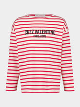 The Ivory and Red Striped Cotton Jersey Long-Sleeved Top by Valentino Garavani combines timeless stripes with a bold "Chez Valentino" print for a stylish, contemporary touch. Made from 100% cotton, this long-sleeved top is soft, breathable, and perfect for casual wear. The striped design and distinctive logo print make it a standout piece, while the lightweight cotton fabric ensures comfort throughout the day. Made in Italy, this top is a versatile addition to any wardrobe, perfect for both relaxed and elevated casual looks.