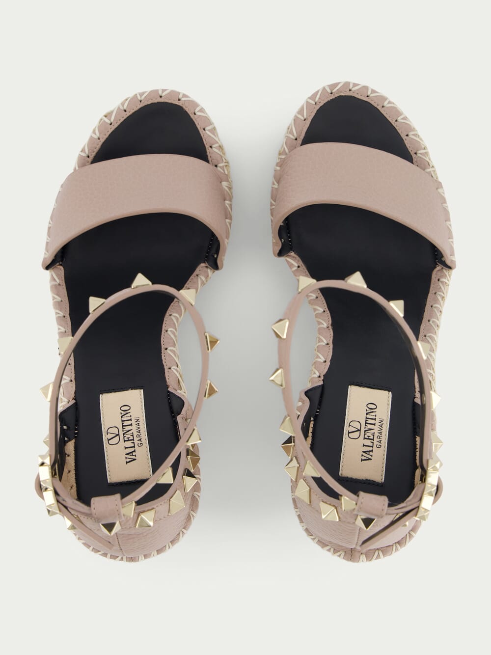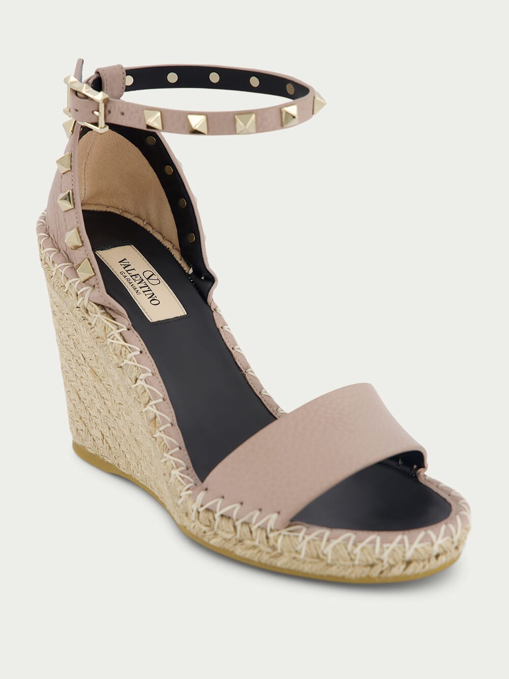 Rockstud 95mm Wedge Sandals, featuring a stunning grained texture for a touch of elegance. Adorned with gold-tone Rockstud embellishment, these sandals exude opulence and style. Secure your step with the buckle-fastening ankle strap, while the single toe strap adds a modern and chic touch. Experience unmatched comfort with the branded leather insole. Elevate your look with the braided 95mm wedge heel, providing both height and sophistication.