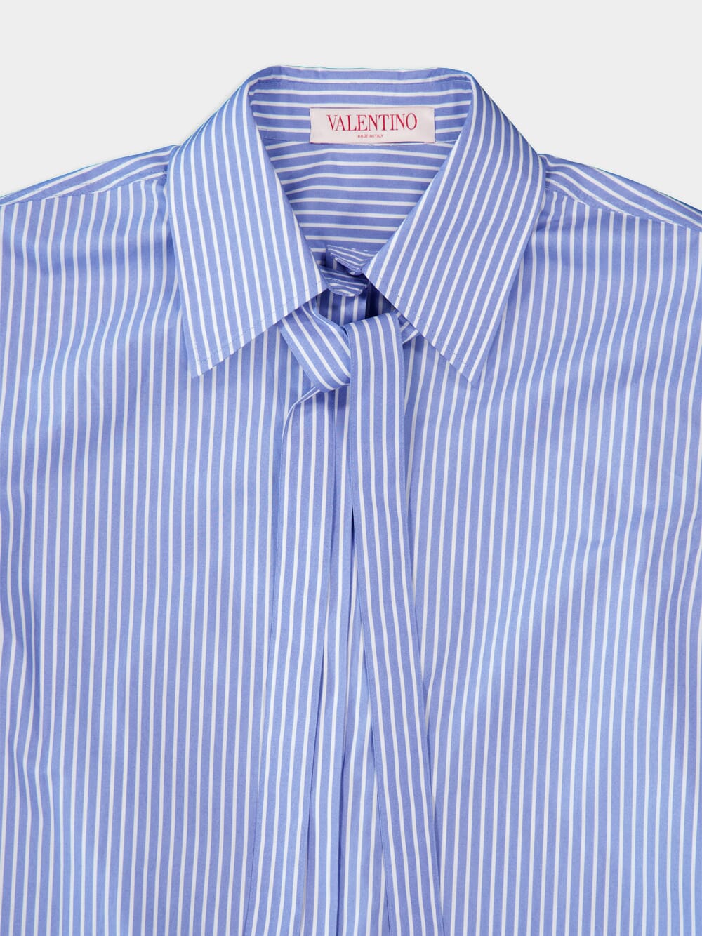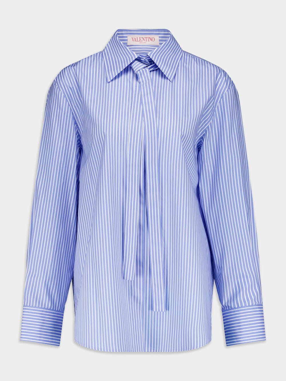 Striped Cotton Shirt crafted in soft poplin texture, this shirt boasts a stylish vertical stripe pattern. The classic collar is elevated with an attached scarf, adding a touch of sophistication. With a concealed front button fastening, long sleeves, and buttoned cuffs, this shirt offers both style and convenience.