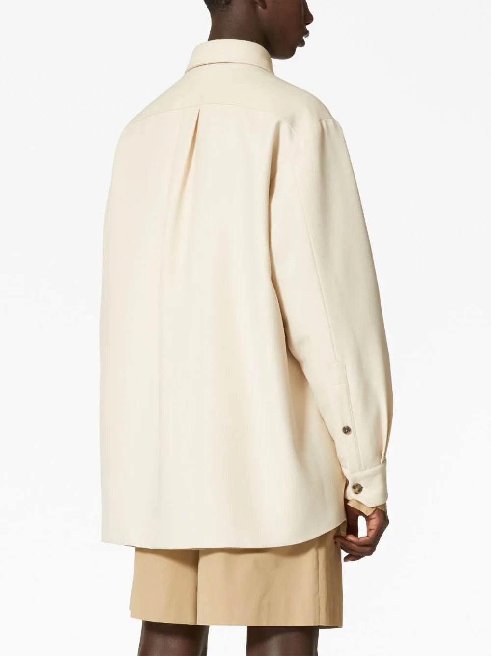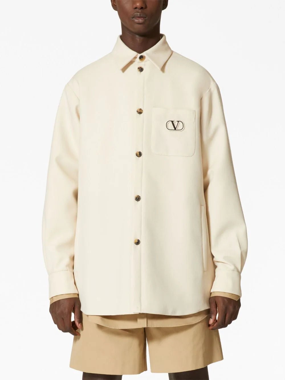 Vlogo Signature Embroidered Shirt Jacket - a perfect blend of style and comfort. Crafted from premium wool, this jacket features a classic point collar, ensuring a timeless look that never goes out of fashion. With its long sleeves and buttoned cuffs, it offers both warmth and versatility, making it an ideal choice for any season. The front button fastening provides effortless wear, while the iconic logo embroidery at the chest adds a touch of sophistication. Complete with a curved hem, this jacket perfectly combines elegance and modernity.