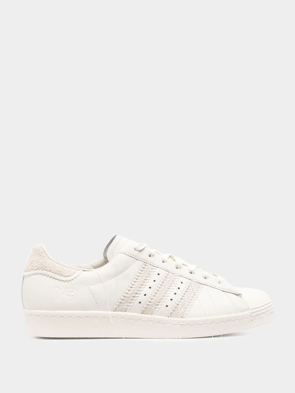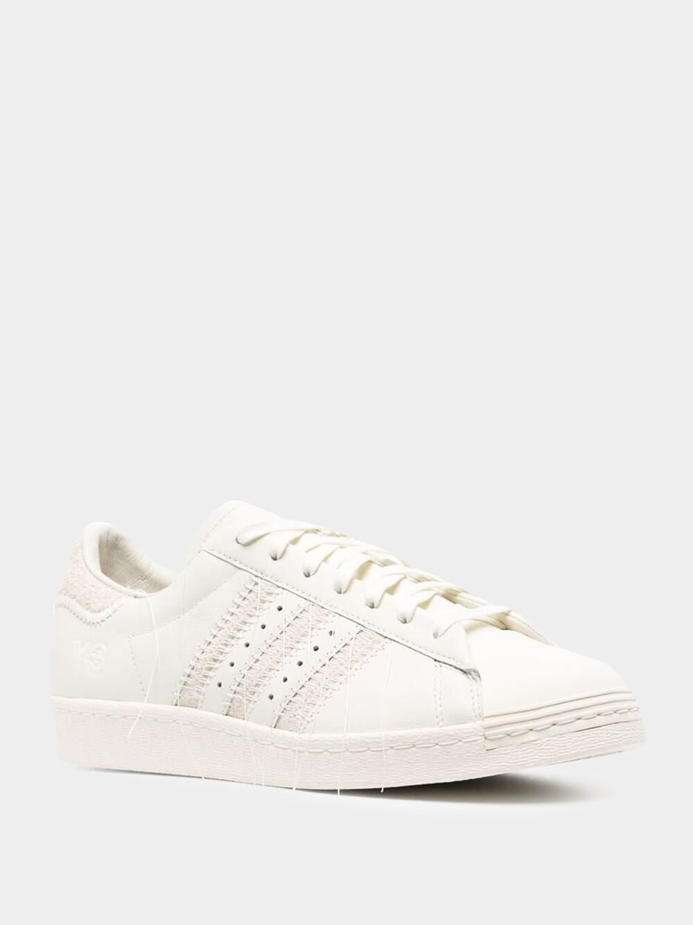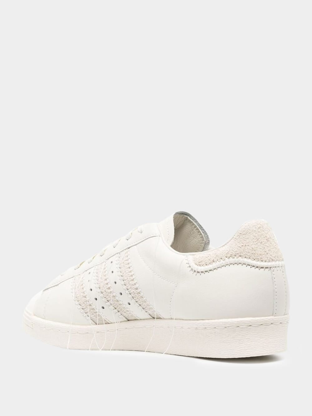 Y-3 Superstar low-top sneakers in white leather featuring a Japanese technique of Sashiko with deliberately hanging threadson on the eyelets, heel cap, midsole and iconic 3-Stripes.