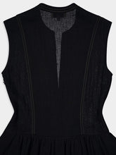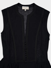 The 'Fermeli' dress is a true testament to timeless style and effortless sophistication. Rendered in classic black, its sleeveless, buttoned bodice with a sharp V-neckline and topstitch detailing accentuates a tailored fit, while the cinched waist with darted pleats enhances the silhouette. The dress then cascades into a fluid midi skirt, crafted from the finest linen that intersperses sheer with solid to offer an elegant balance. Perfect for a variety of occasions, this dress is a versatile staple for any discerning wardrobe.