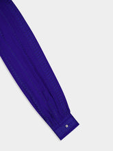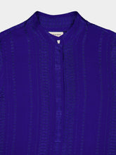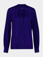 This sapphire blue blouse with delicate pleating offers a modern take on classic sophistication. The high neck and long sleeves create an elegant profile, perfect for professional settings or chic events. Its textured pattern adds a layer of depth to the garment's allure.