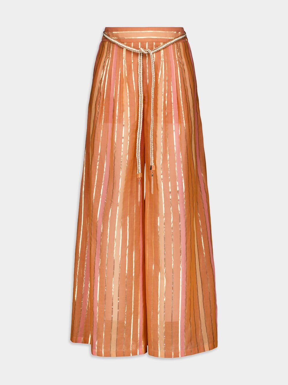 Striped Wide-Leg Trousers, crafted with precision using metallic threading, these trousers showcase a captivating vertical stripe pattern. Embrace fashion-forward flair with their flattering high waist and accentuate your curves with the belted waist feature. Experience unrivaled comfort and effortless style with their wide-leg silhouette, perfect for any occasion.