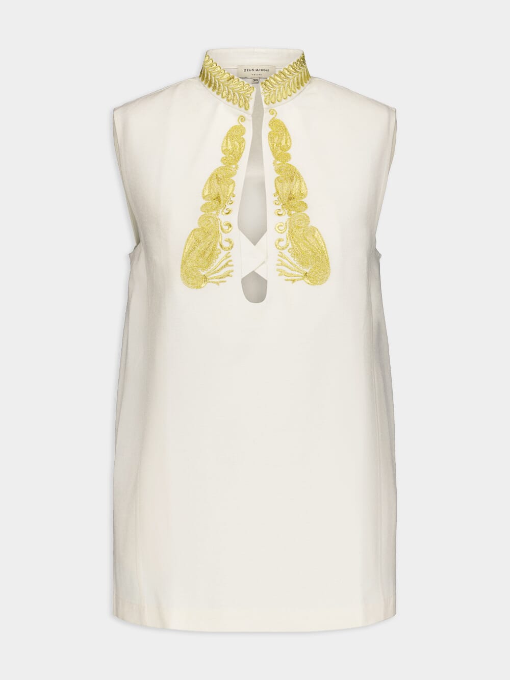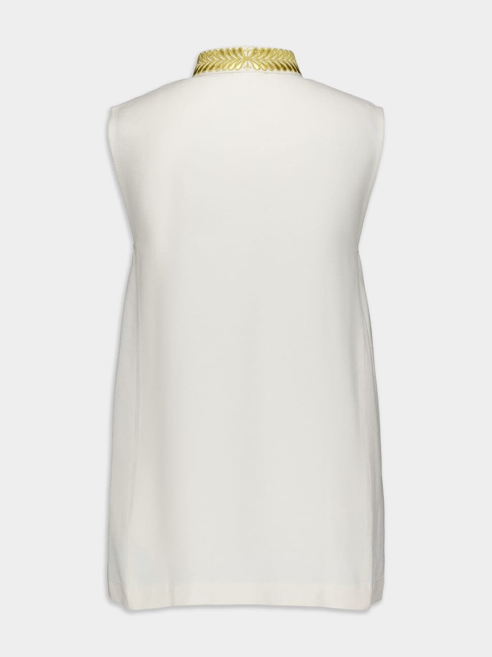 Sleeveless top crafted in luxurious white silk, this top exudes elegance and sophistication. The sleeveless design offers a chic and versatile look, perfect for layering or wearing on its own. The soft and lightweight fabric ensures all-day comfort, while the impeccable craftsmanship guarantees long-lasting quality.