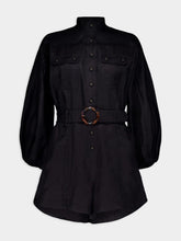 ZIMMERMANN Belted Cotton Playsuit. crafted from a blend of cotton and linen, offering a comfortable and breathable fit. Its round neck and front button fastening add a touch of sophistication, while the belted waist enhances your silhouette. With three-quarter length sleeves and multiple pockets, including two chest patch pockets and two side slit pockets, this playsuit combines functionality with fashion.