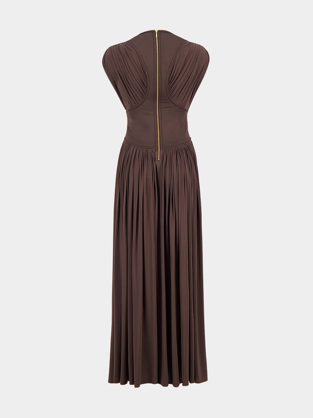 The Illuminate Column Dress in Chocolate from Zimmermann’s Spring 2025 Illumination Collection is a dramatic and elegant silhouette, designed to flatter with architectural precision. Featuring a rounded neckline and a fixed waistband, the maxi-length design is defined by heavy gathering through the bodice and waist, which creates texture and depth. Front skirt splits add graceful movement, while a centre back zip ensures a structured fit. A powerful piece with timeless sophistication.
